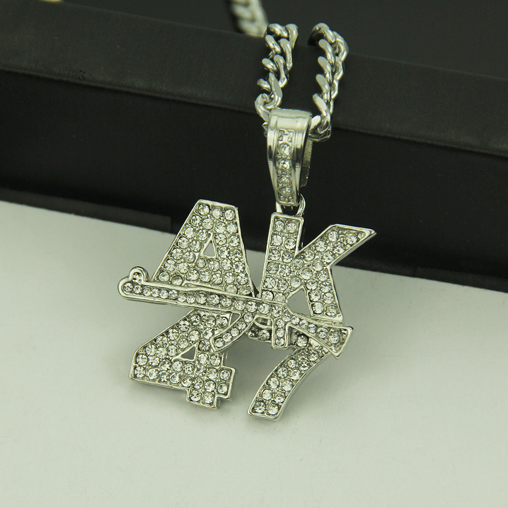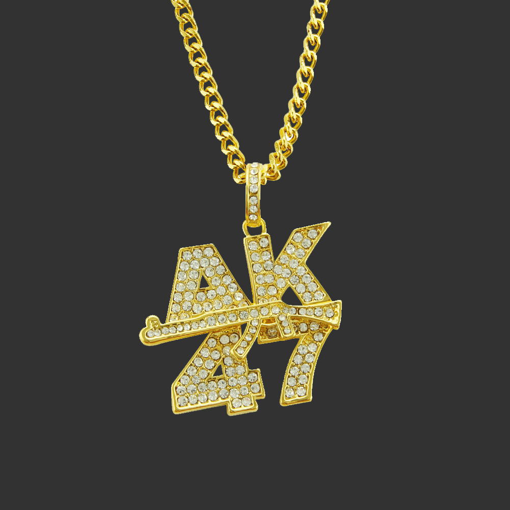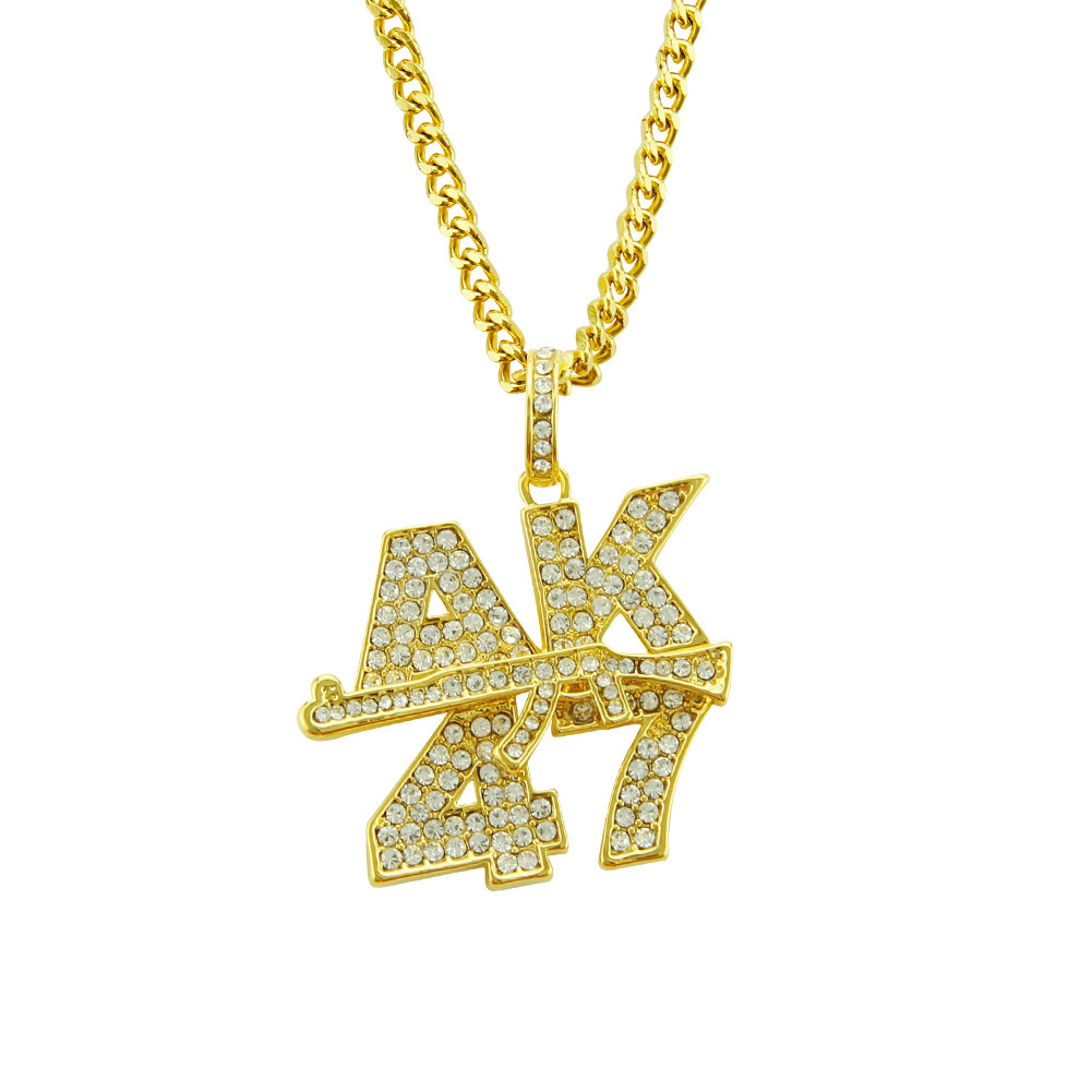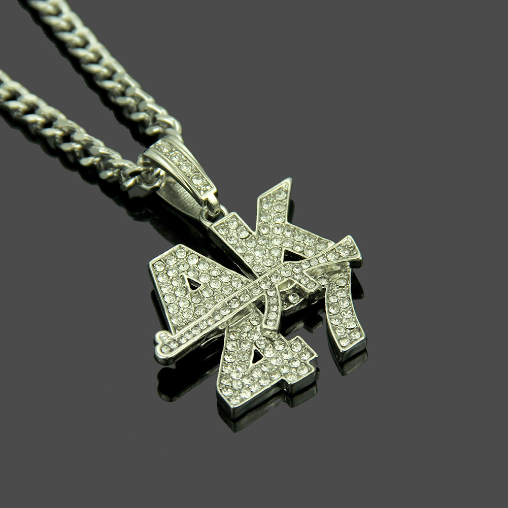 Material: Environmental protection zinc alloy AK47 gun pendant + high quality glass rhinestonesSize: Chain length 76cm; 3.7*3.7 cm AK47 gun pendant
