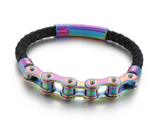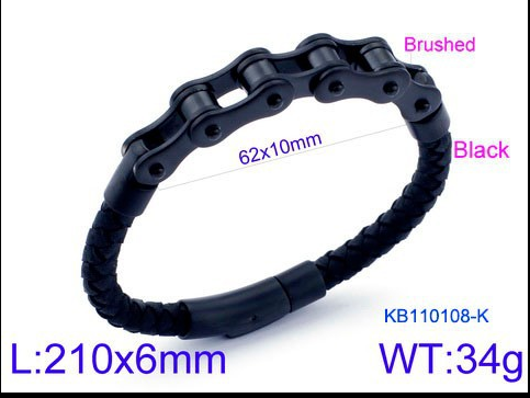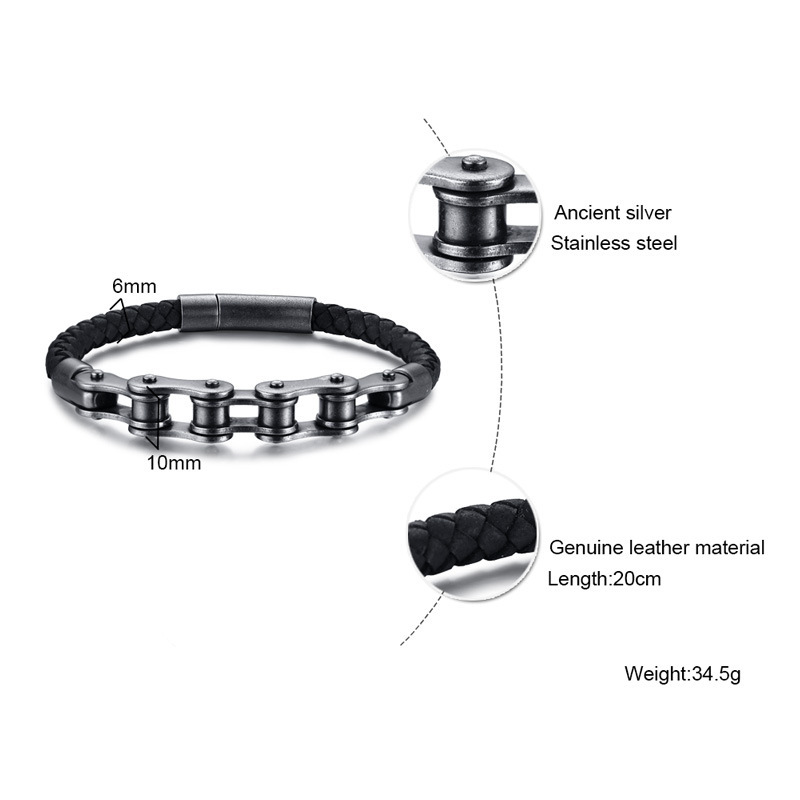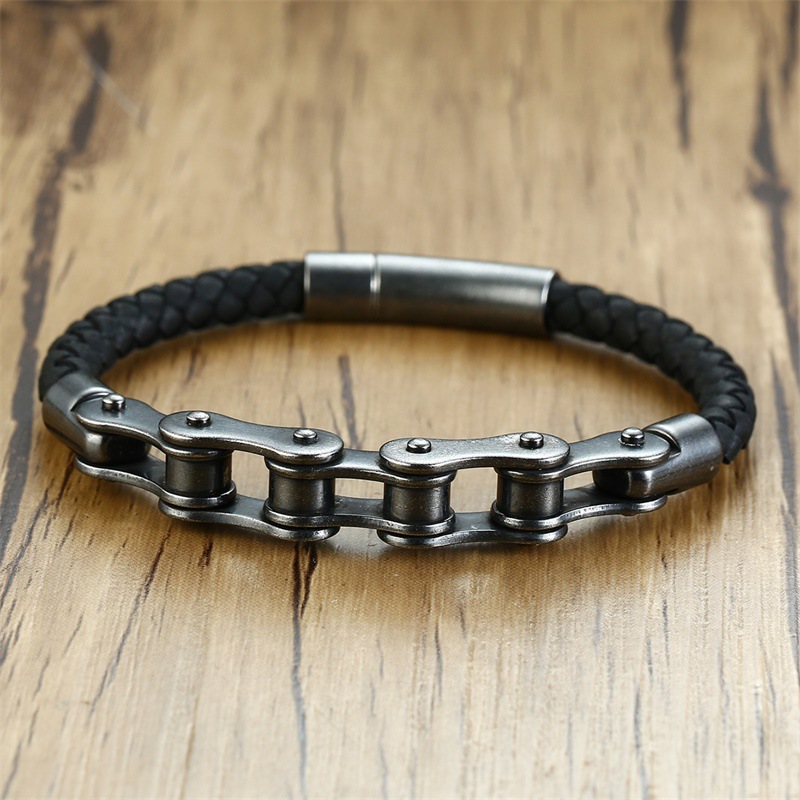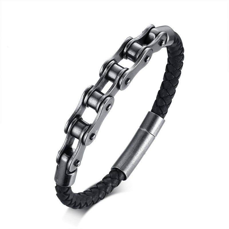Stainless steel bicycle chain leather bracelet black men's bracelet
