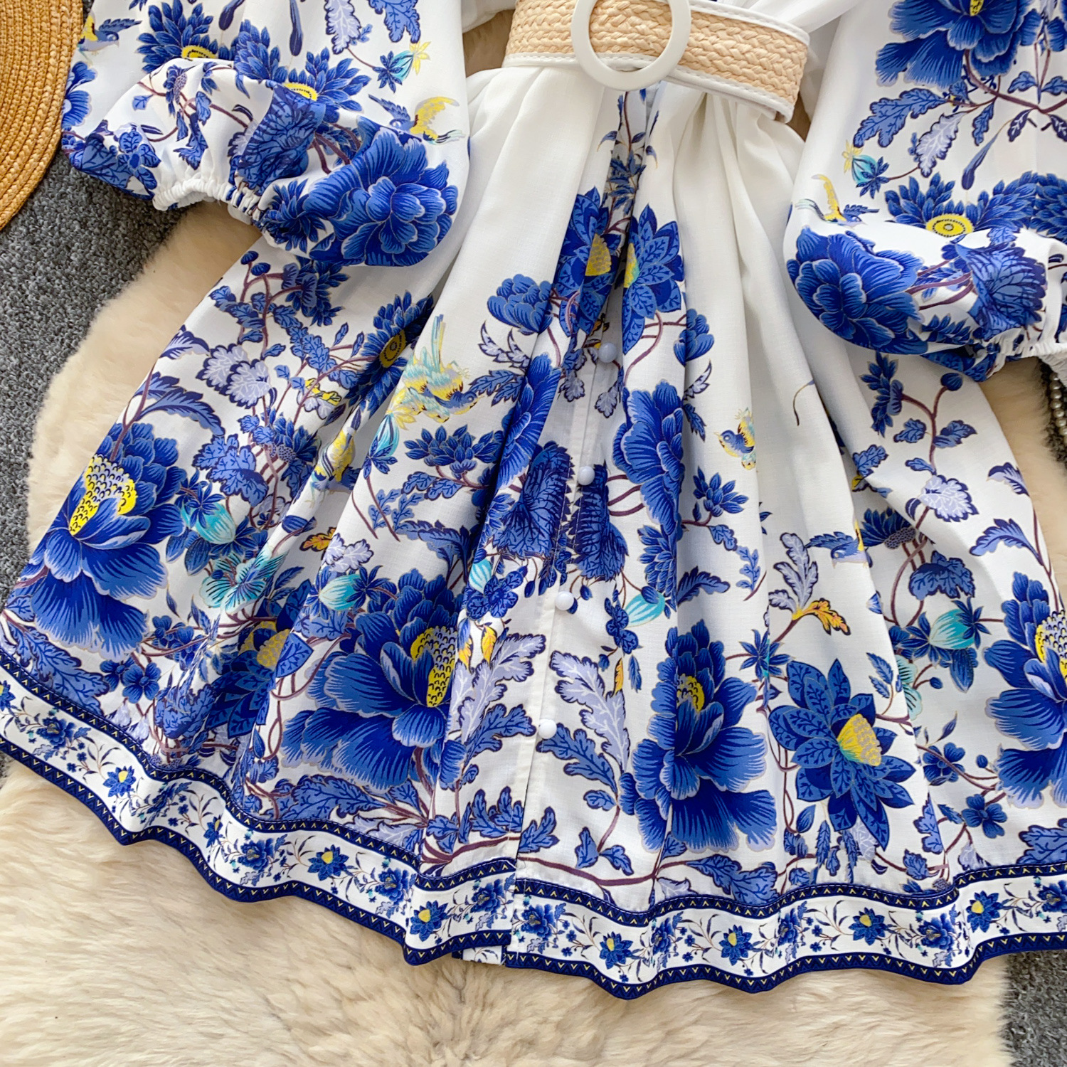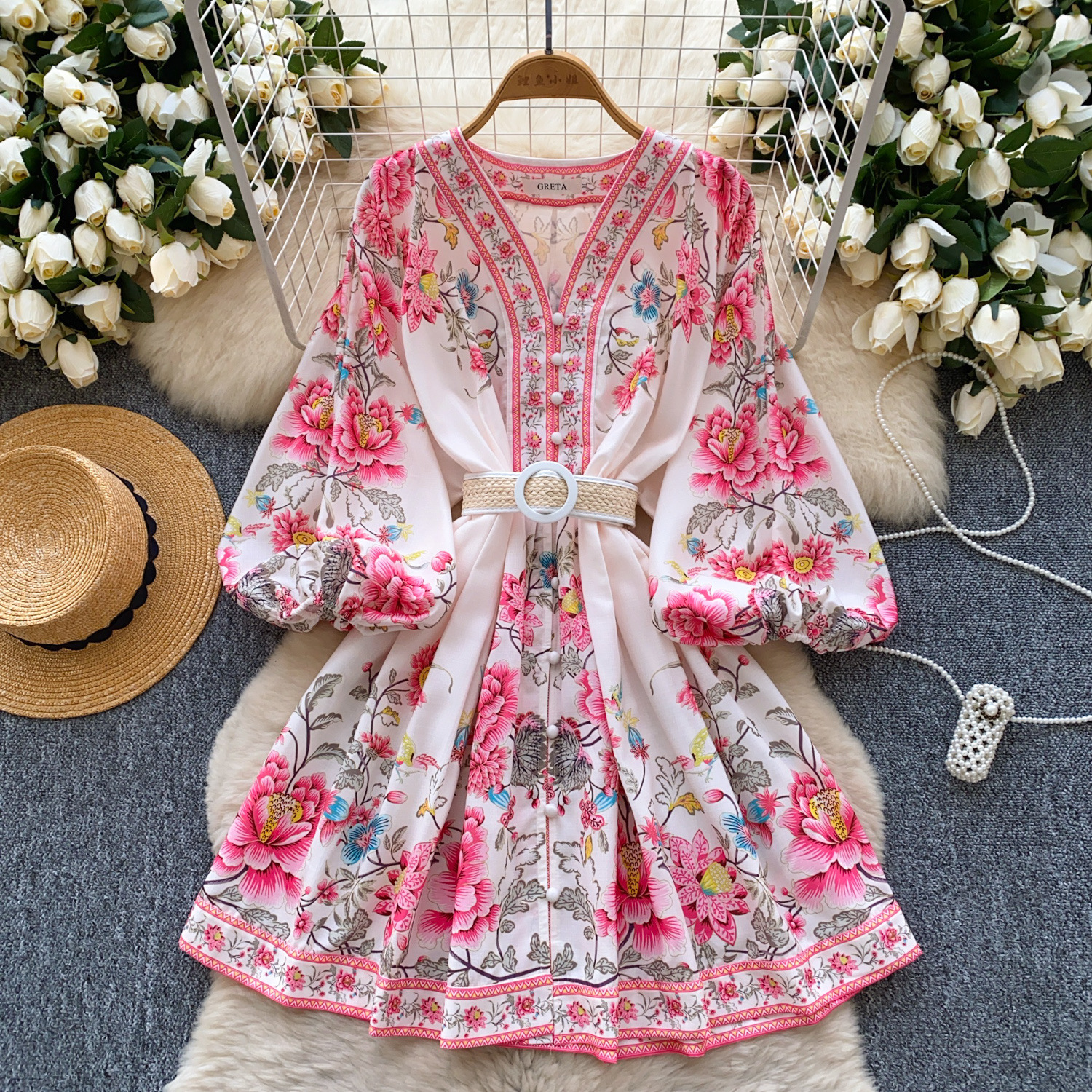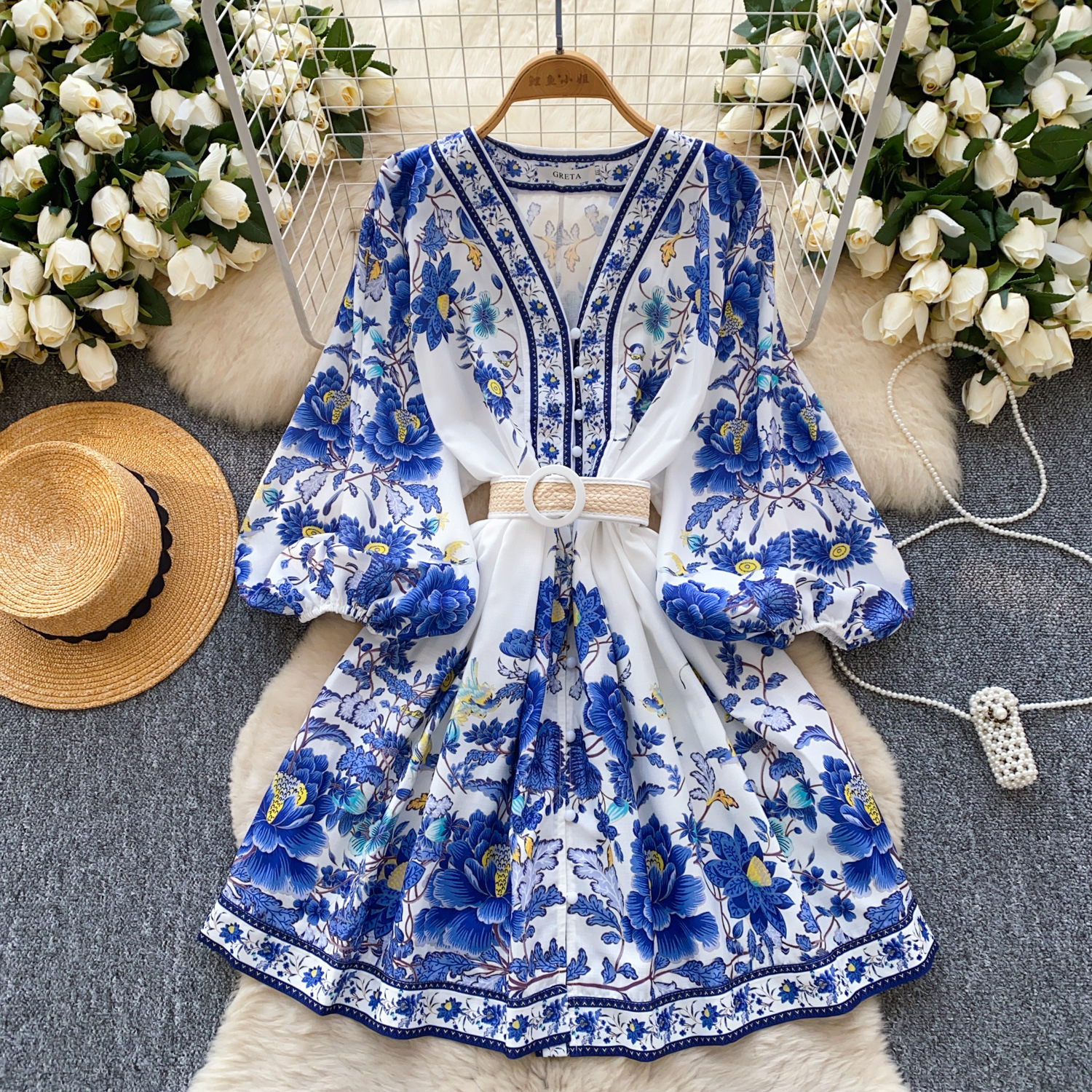 V-neck Lantern Sleeve Pleated A- Line Short Skirt