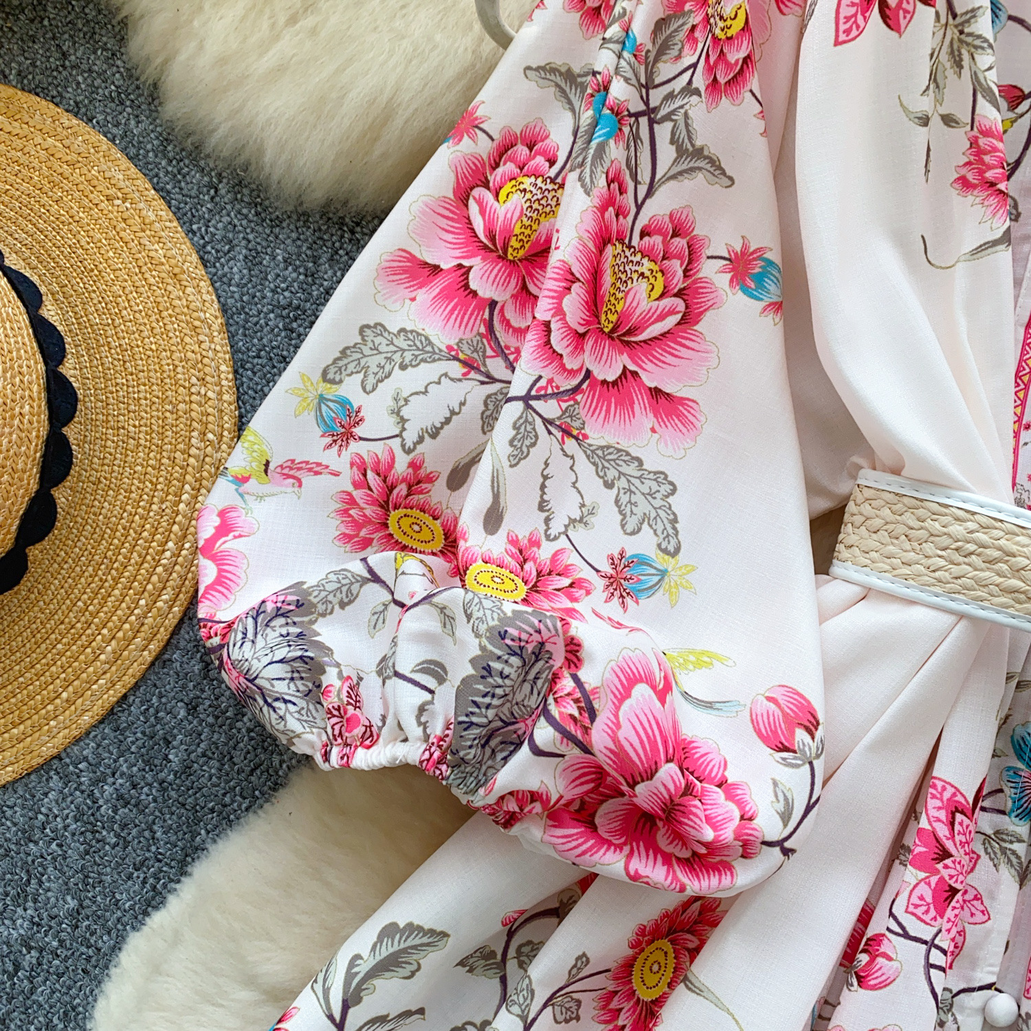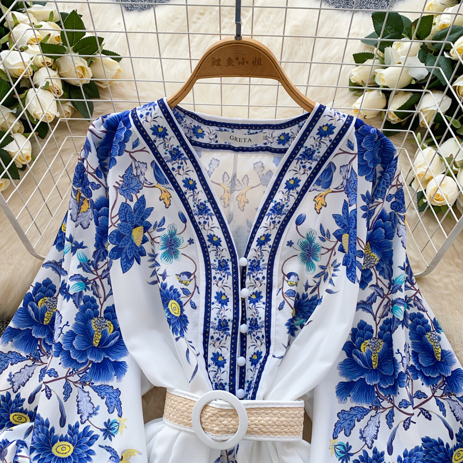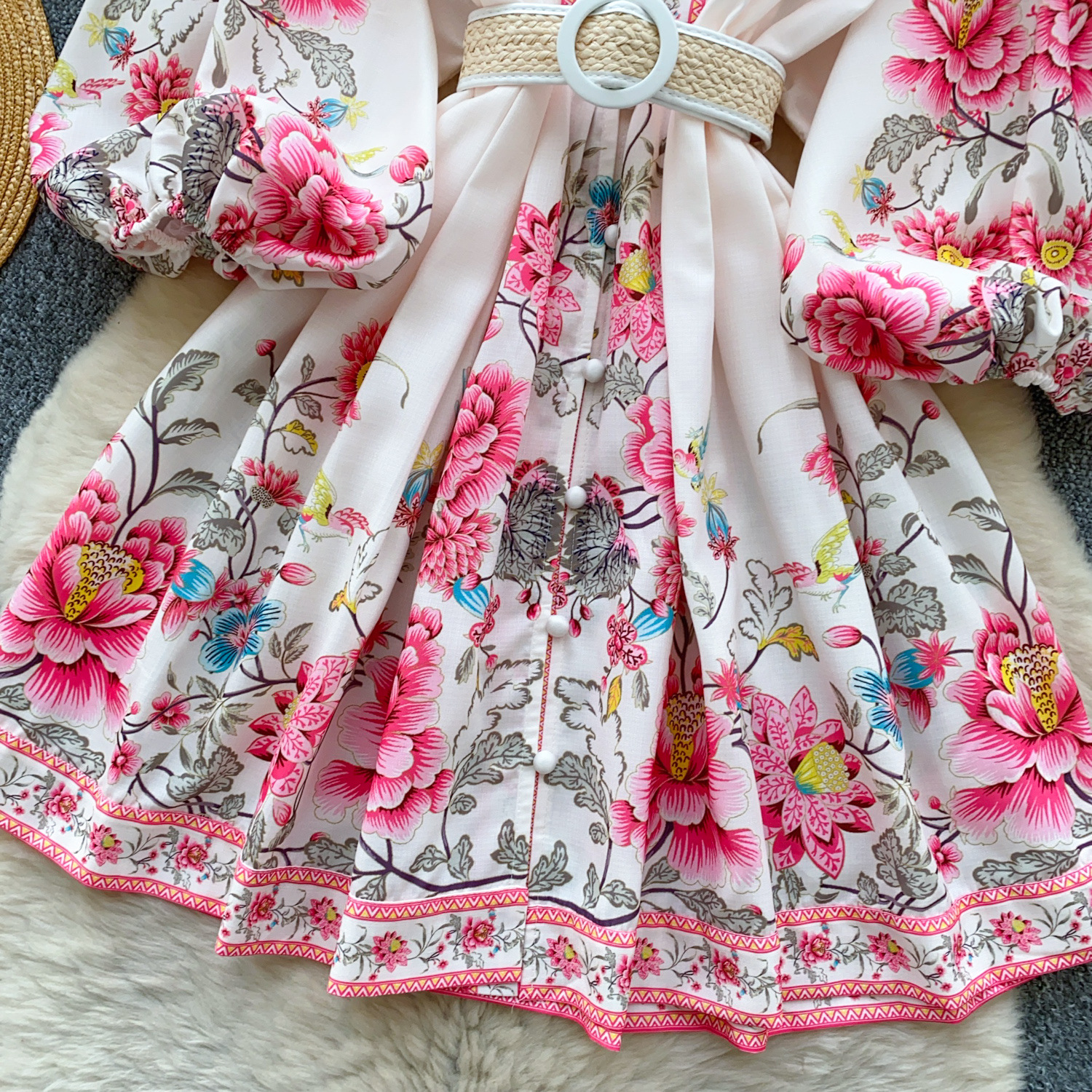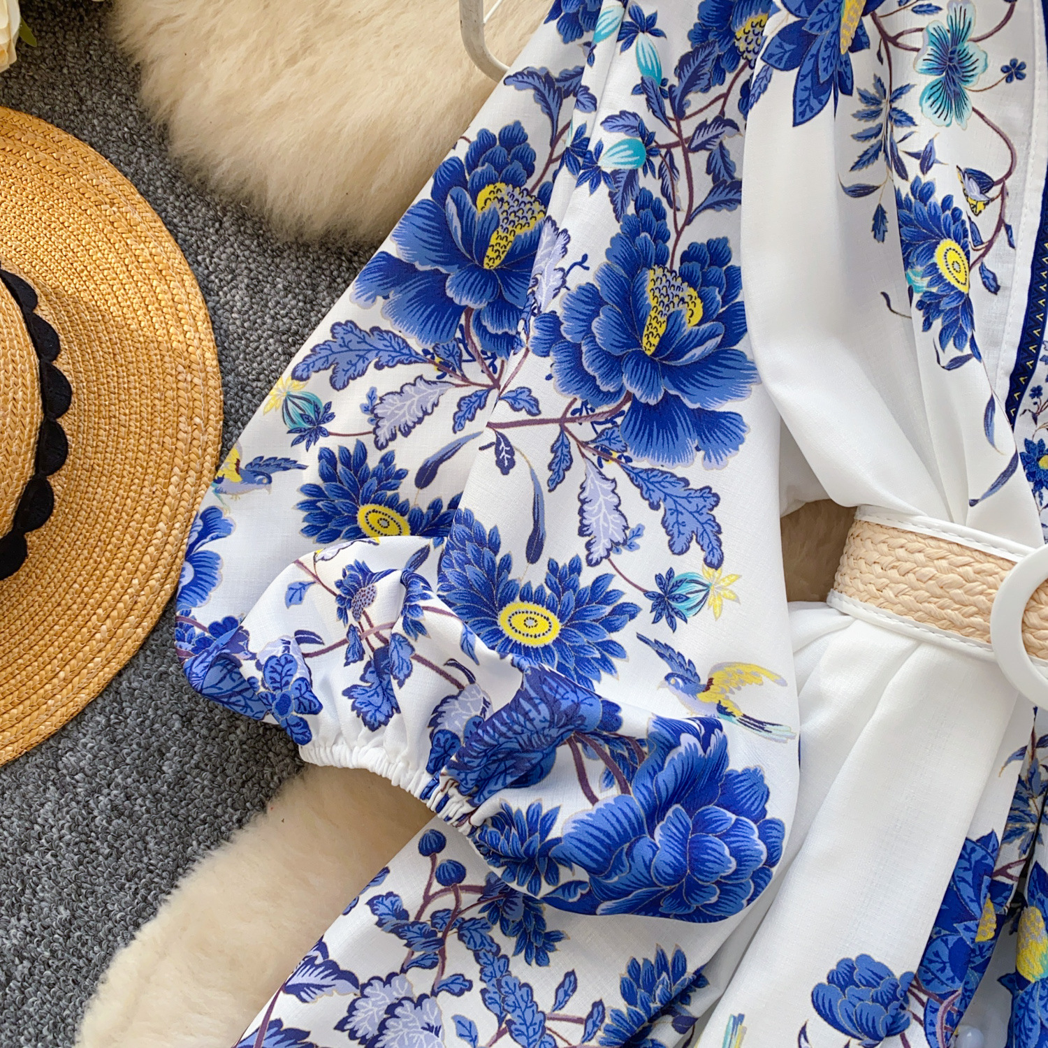 V-neck Lantern Sleeve Pleated A- Line Short Skirt