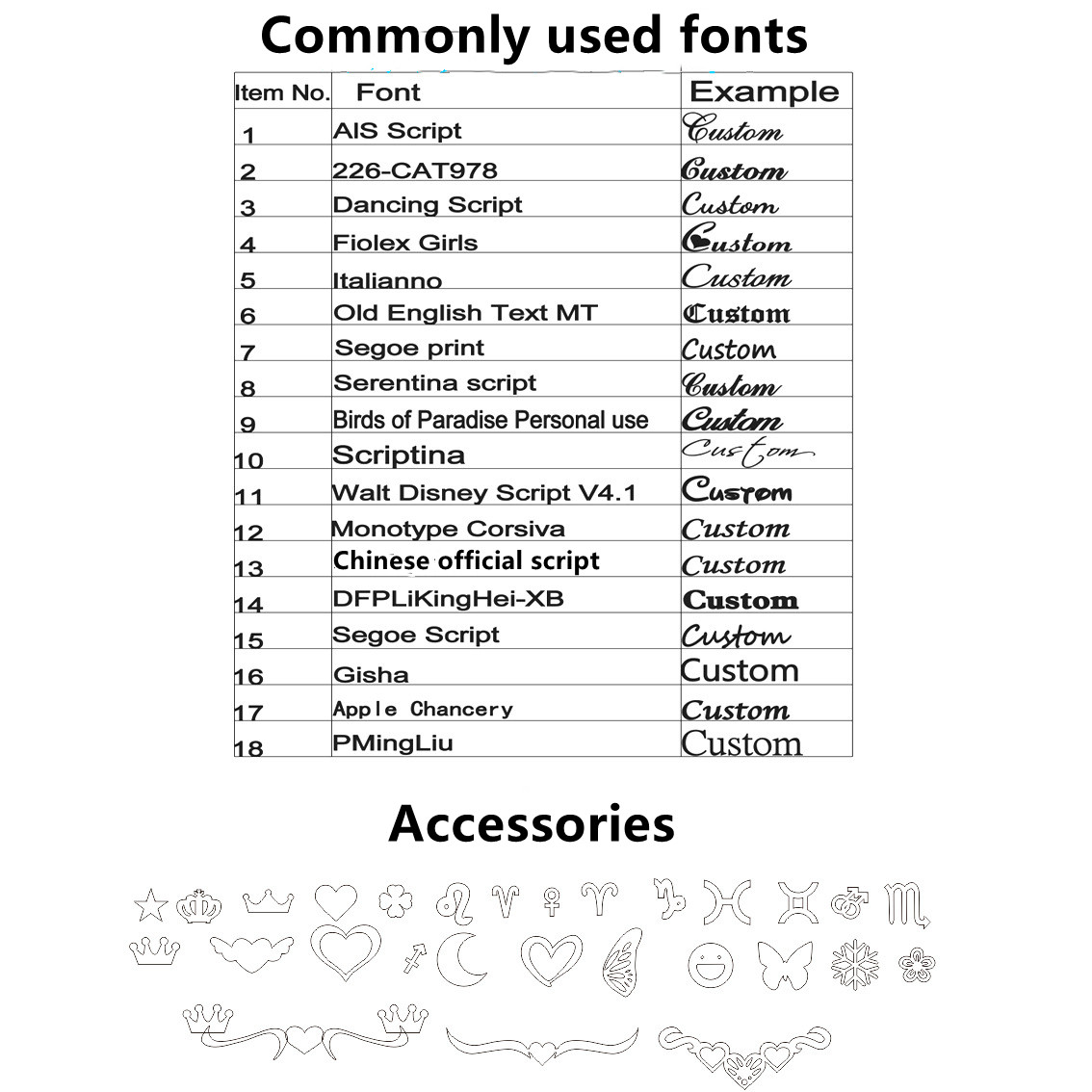 1. Pay attention to the text content, font requirements and chain length to be completed (conventional bracelet chain length: 17CM + 5CM necklace 47CM + 5CM)
