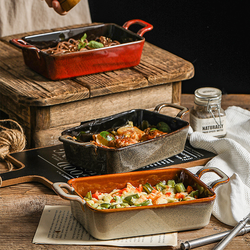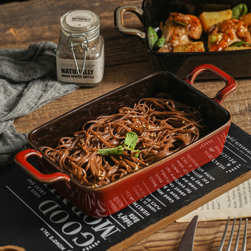 Product Information:Material: PotteryShape: rectangleMicrowave oven: availableColor: binaural pan - kiln beige, binaural pan - kiln brownish grey, binaural pan - kiln redDiameter: 10-10.9cmPacking List:Ceramic tableware x1