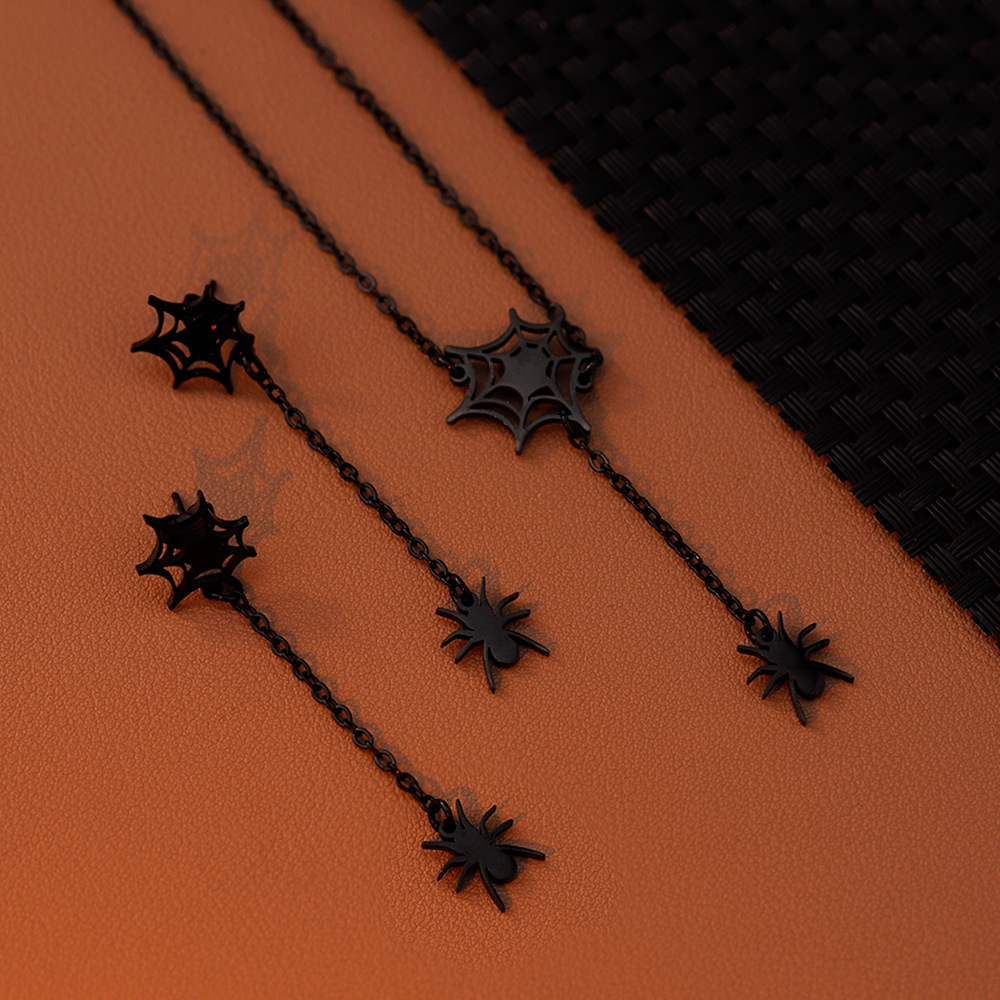 Color: Steel Spider necklace, gold spider necklace, rose gold spider necklace, black spider necklace, Steel a pair of spider earrings, gold a pair of spider earrings, rose gold a pair of spider earrings, a pair of black spider earrings