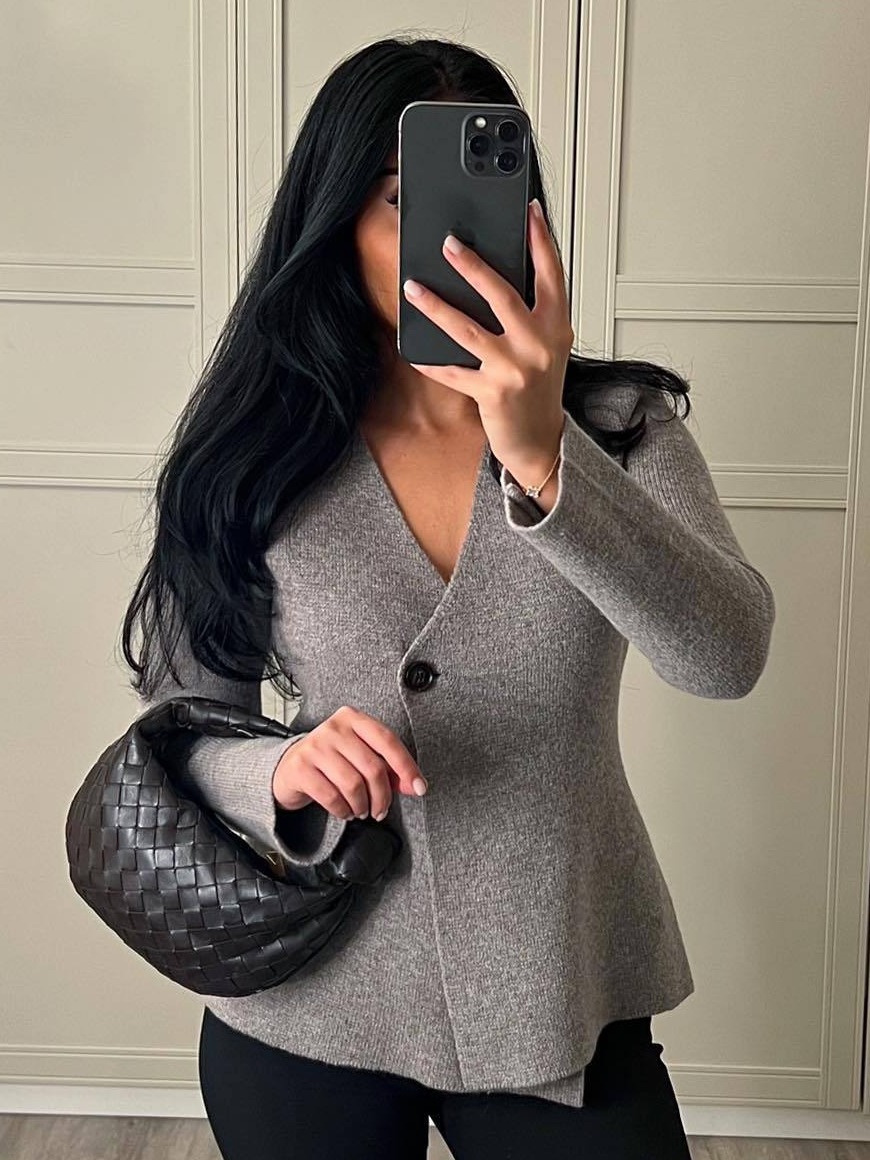 Product information: Pattern: solid color Color: Gray Size: S,M,L Popular elements: Button Style: Cardigan Main fabric composition: Polyester Craft: collage/stitching