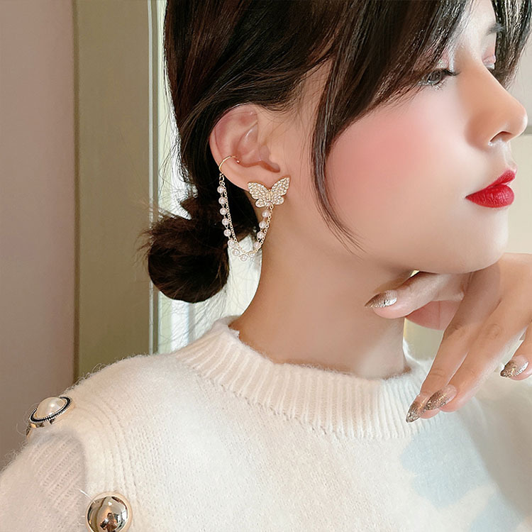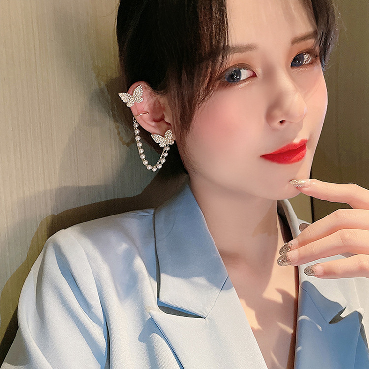 Fashion: ins personality micro-studded asymmetrical earrings full of diamonds temperament beautiful pearl butterfly ear bone clip integrated earrings women