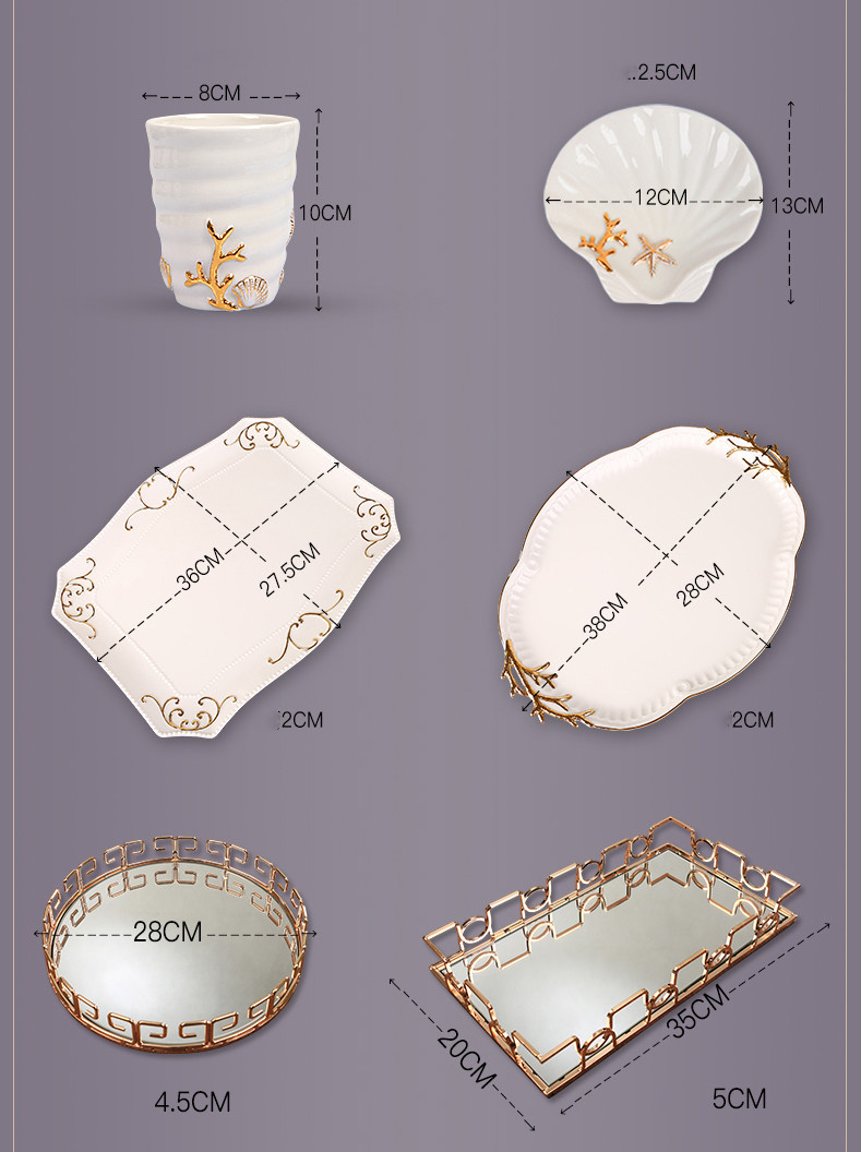 Specifications: Toothbrush holder (can hold ordinary toothbrushes), soap dish (no drain hole), ceramic marine tray (can hold 6 pieces), ceramic pearl tray (can hold 6 pieces), alloy rectangular tray (can hold 6 pieces), Alloy four-legged tray (can hold 6 pieces), alloy round tray (can hold 5 pieces), alloy oval tray (can hold 6 pieces)