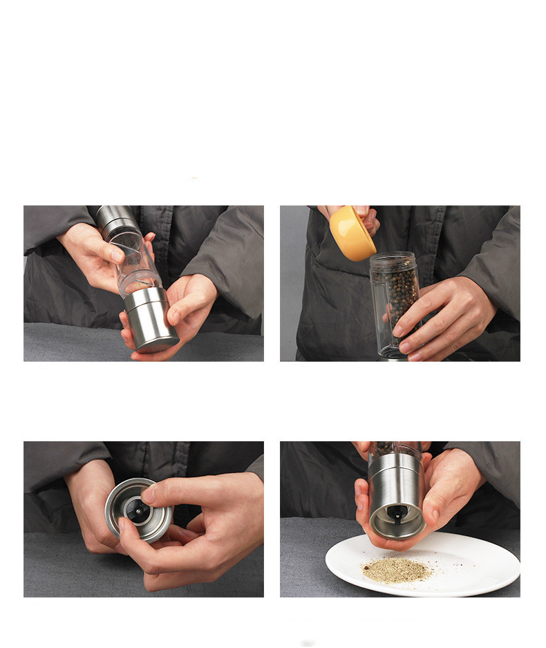 Product Name: Double-head dual-purpose grinderMaterial: stainless steel, acrylicUses: grinding of pepper, pepper and other food ingredientsSize: about 22cm * 5cm.Capacity: about 165ml
