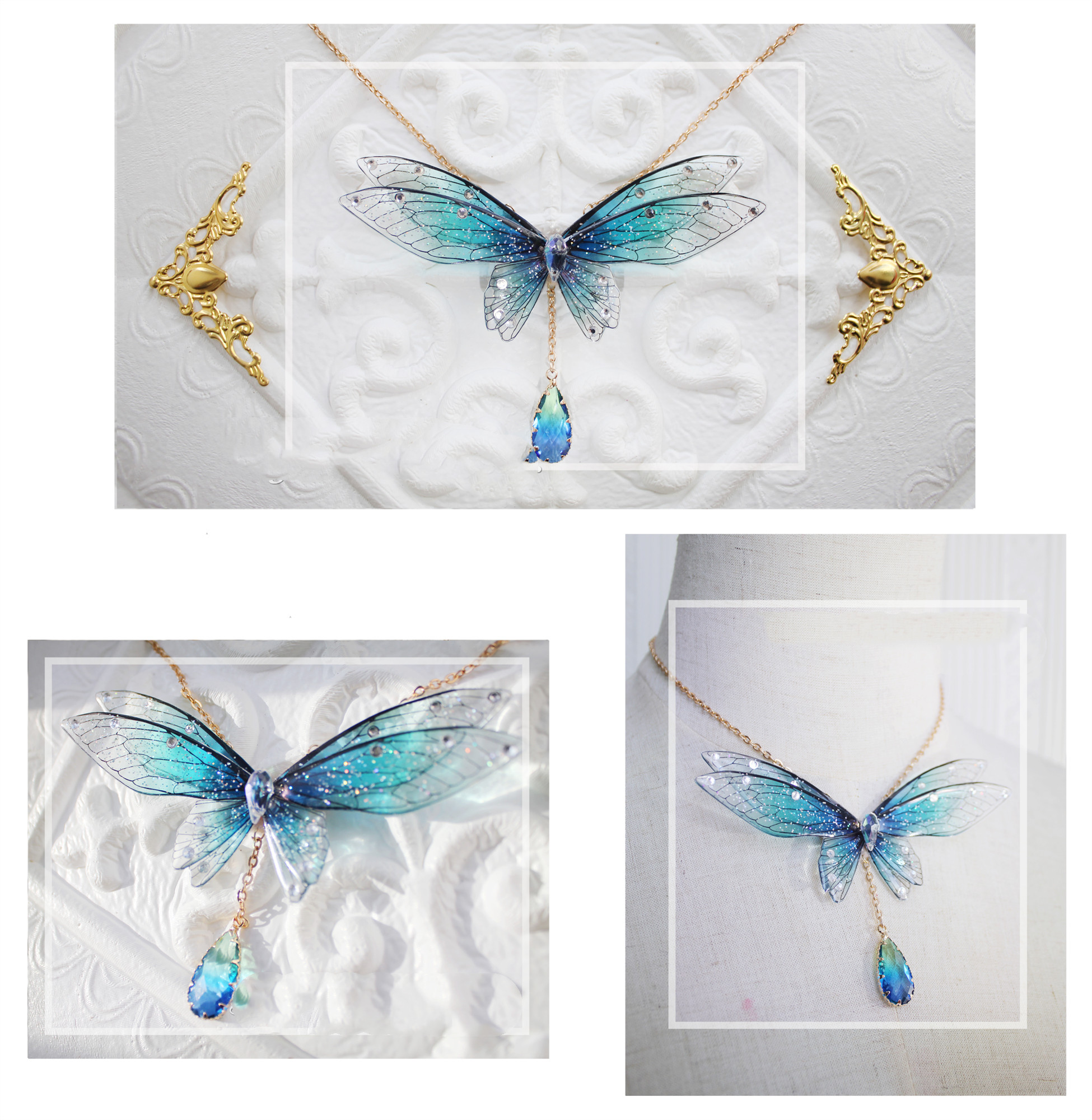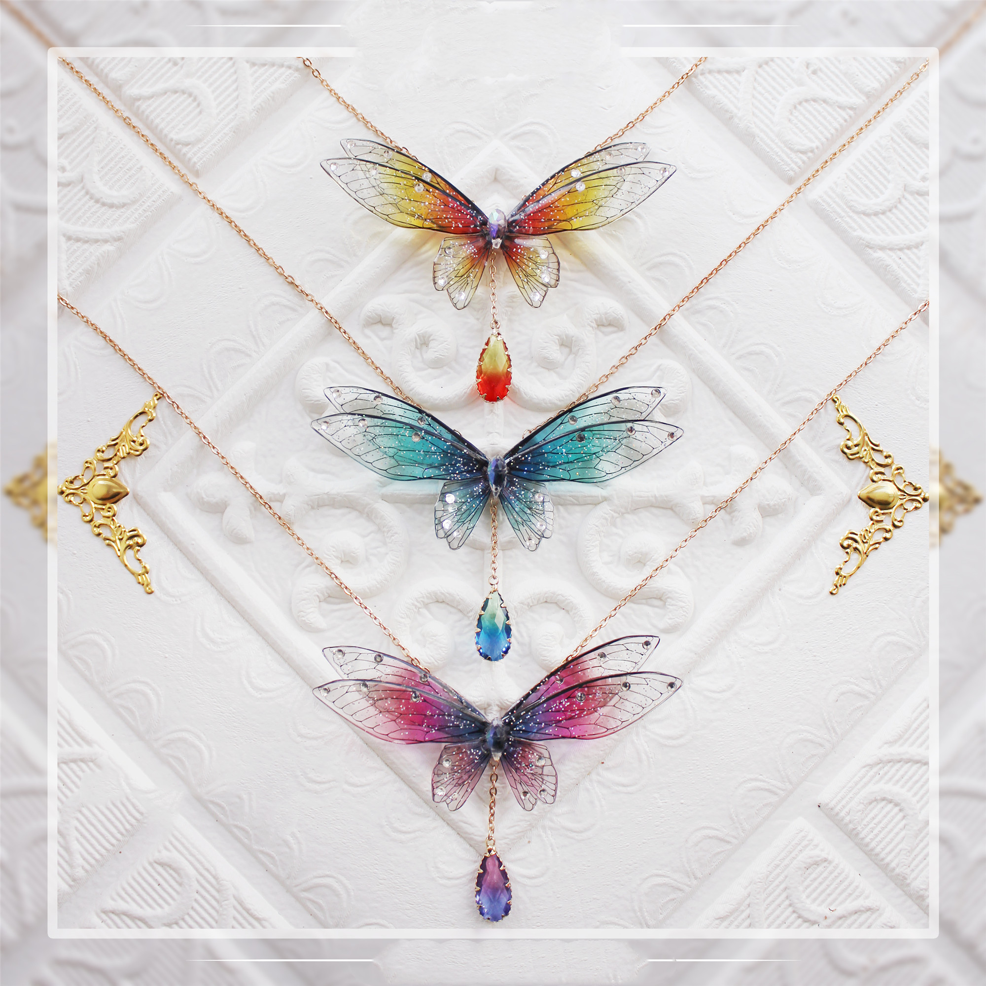 Description: 8 pieces of adhesive wings, sparkling diamonds, plated crystal, and gradient glass pendant;