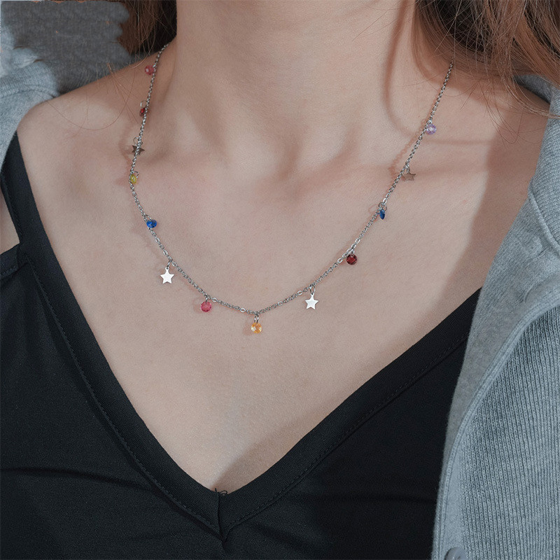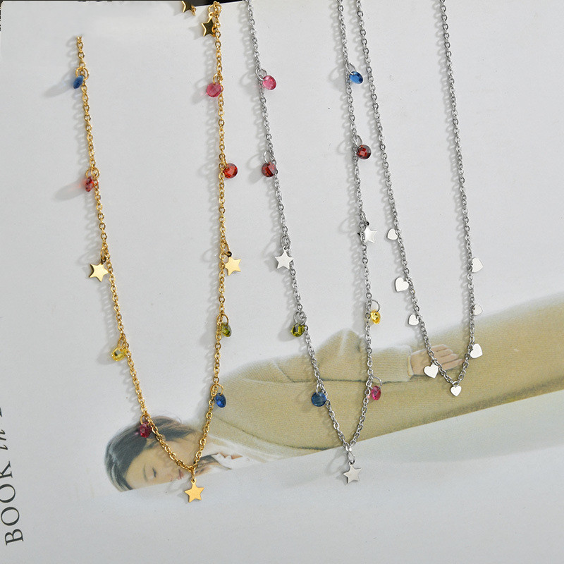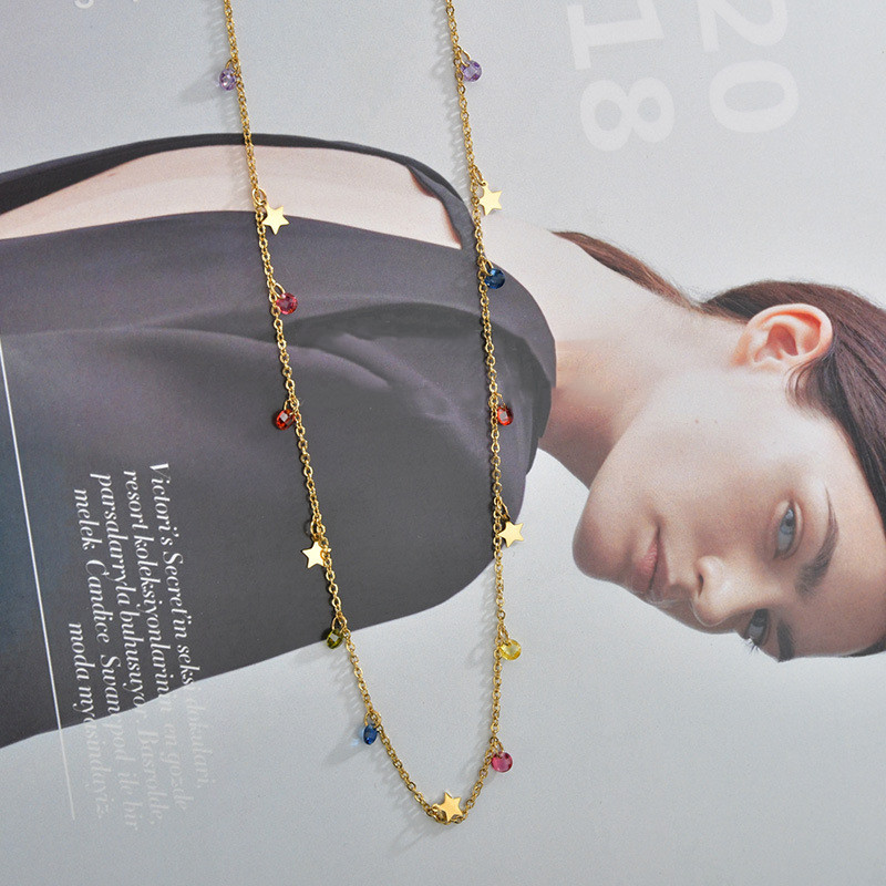 Color: Five-pointed star and pointed bottom colored diamond necklace, steel color, five-pointed star, pointed bottom colored diamond necklace, gold
