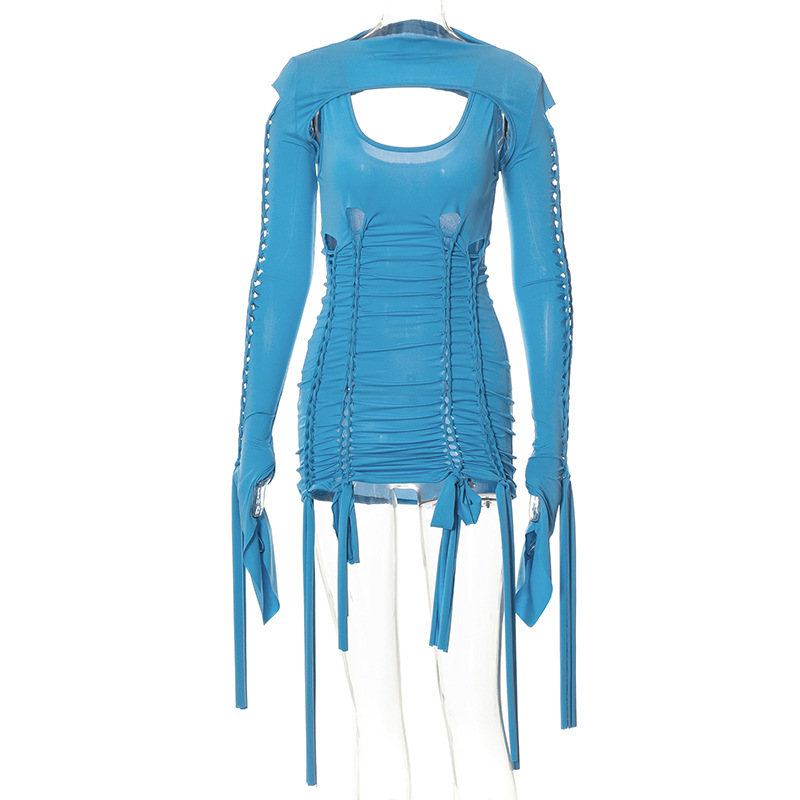 Long-sleeved Woven Cut Out Tie Wrap Hip Dress