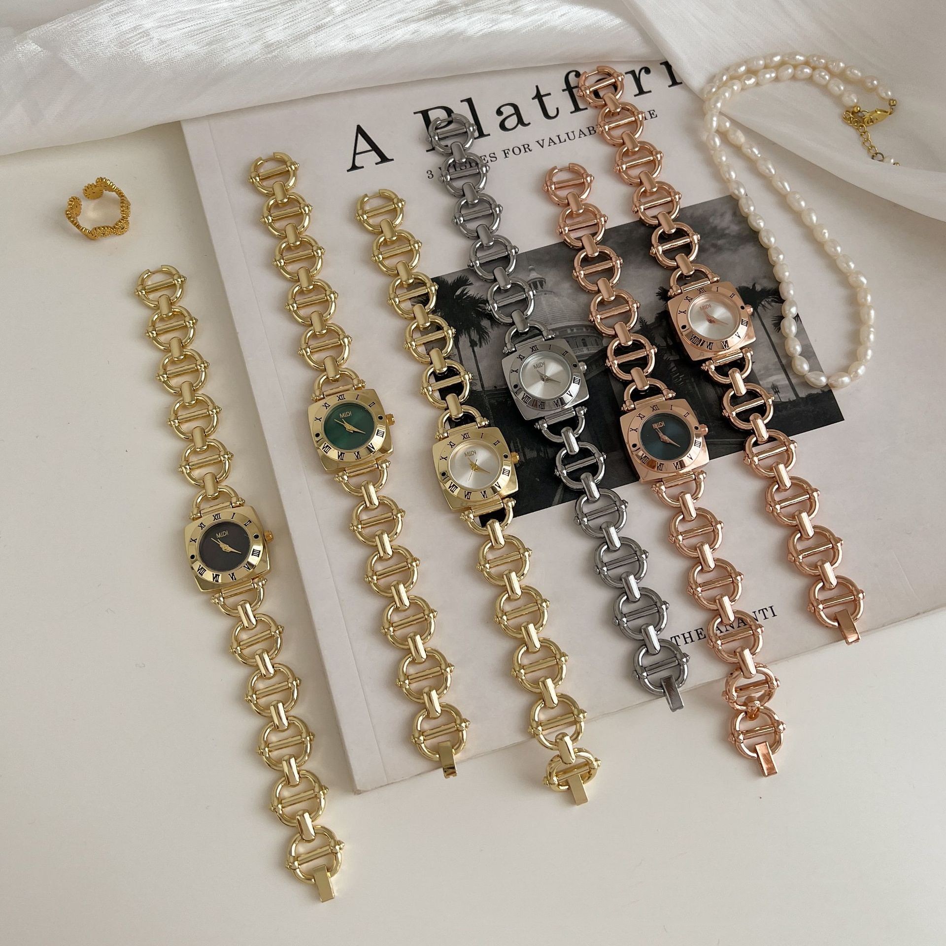 Color: gold strap white surface, gold strap green surface, gold strap black surface, rose gold white surface, rose gold black surface, silver stripe white surface