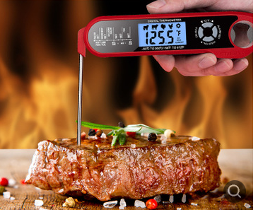 Features: Press ON/OFF (confirm key), C/F blue and white backlight, calibration function, life waterproof, strong magnetic, corkscrew function alarm function. Meat selection function, large battery. Large screen double probe thermometer
