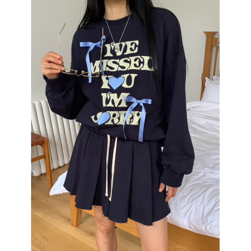 Product information: Pattern: Letters Fabric name: Polyester Color: gray, navy blue Size: free size Applicable Gender: Female Skirt length: short skirt Sleeve length: long sleeve Popular elements: Bow