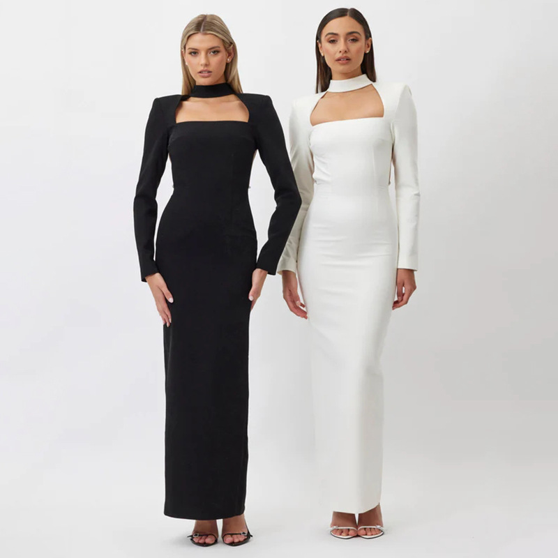 Color: white, black, made of direct tribute fabric, sexy backless with rhinestone slit hemline at hem design, note: excluding padded shoulder, all colors and sizes in stock