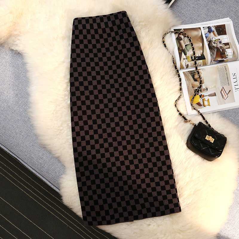 Chessboard Plaid Slim-fit Sheath A- Line Mid-length Plaid Stretch Knitted Overskirt