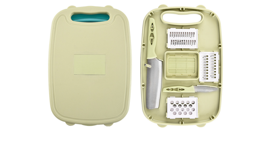 Product specifications: Cutting board X1, slicing knife X1, fruit knife X1, draining vegetable basket X1, various grating blades X5