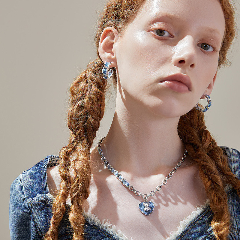 Product information:Color: Denim woven earrings, Denim Heart Bear necklaceApplicable people: womenMaterial: AlloyShape: GeometricPopular elements: RingStyle: Personality