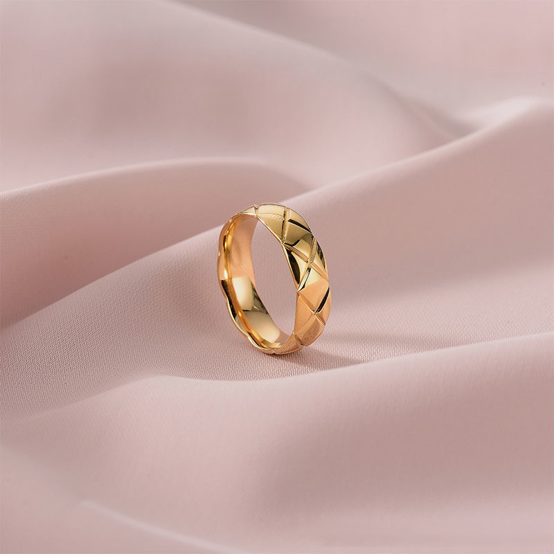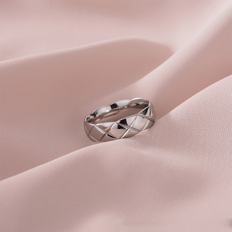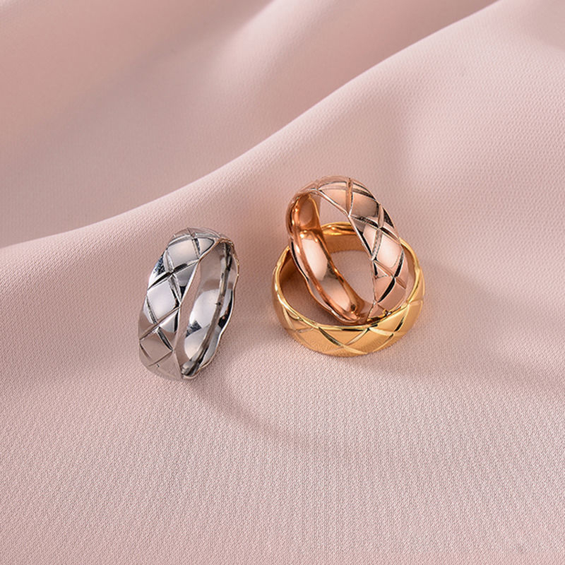 Material: titanium steelShape: rhombusTreatment process: electroplatingStyle: UnisexColor: silver, gold, rose goldSize: No. 6, No. 7, No. 8, No. 9, No. 10, No. 11Popular elements: lace