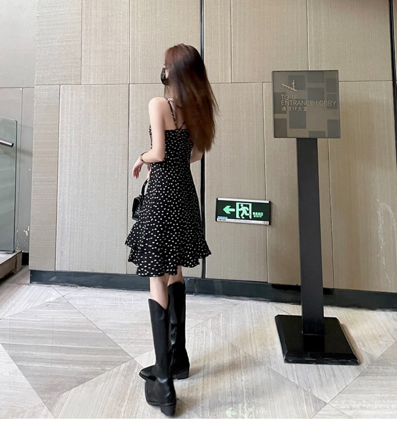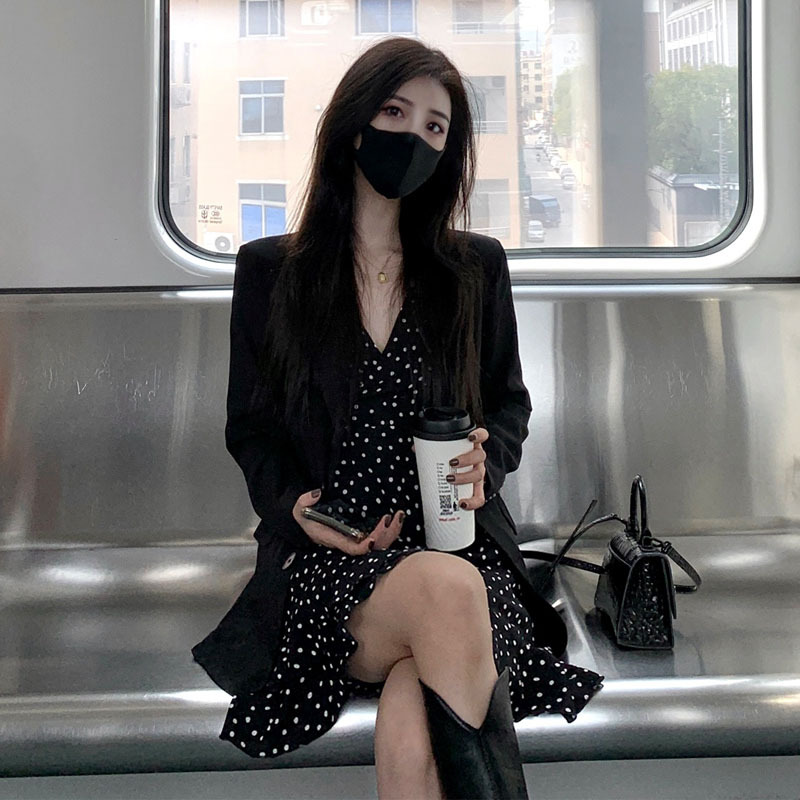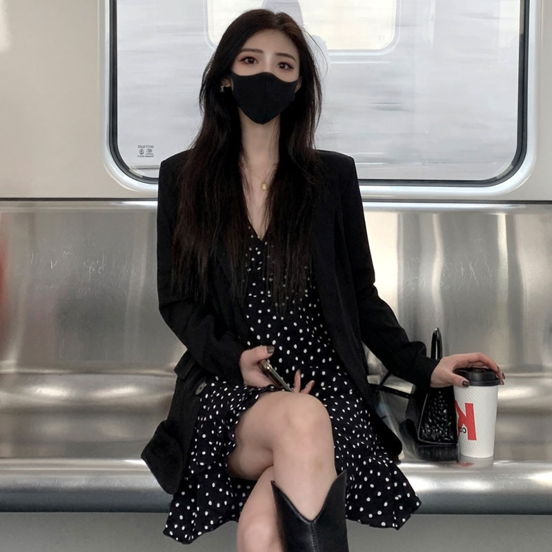 Color: Polka-dot suspender skirt, black suit