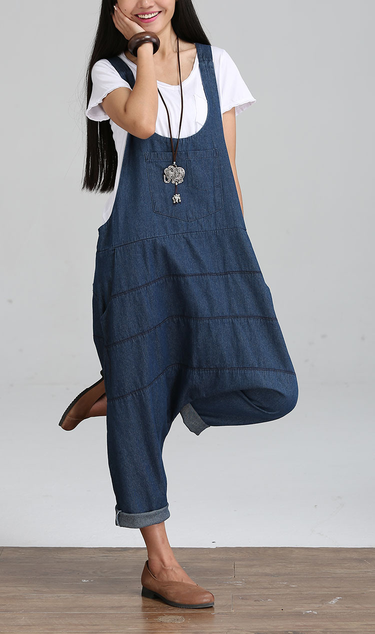 Vintage Women Jumpsuits Palazzo Pants Denim Jumpsuit Harem Pants Straps Pockets Jumpsuits Casual Pants Jumpsuit