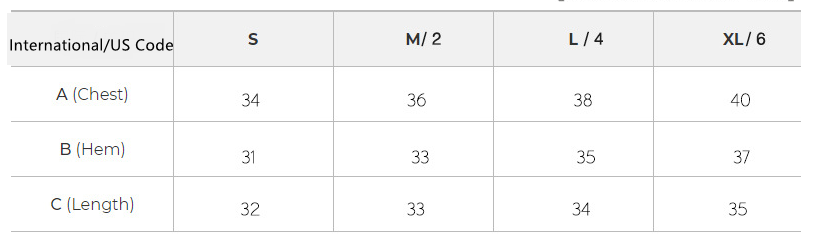 | B (Bust) | 36 | 38 | 40 | 42 |