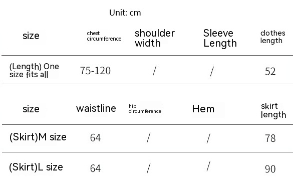 Size: free size top, M size skirt 78cm,L size skirt 90cm,M size suit 78cm,L size suit 90cm