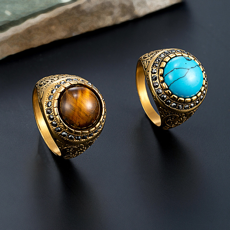 Product information:Type: Ring Treatment Process: inlaid gem Color: turquoise ring, Tigereye ring Applicable people: Unisex Size: no.8, no.9, no.10, no.11, no.12 Material: titanium steel Style: Retro