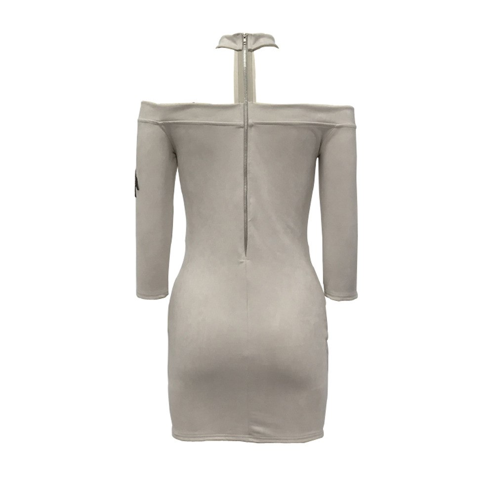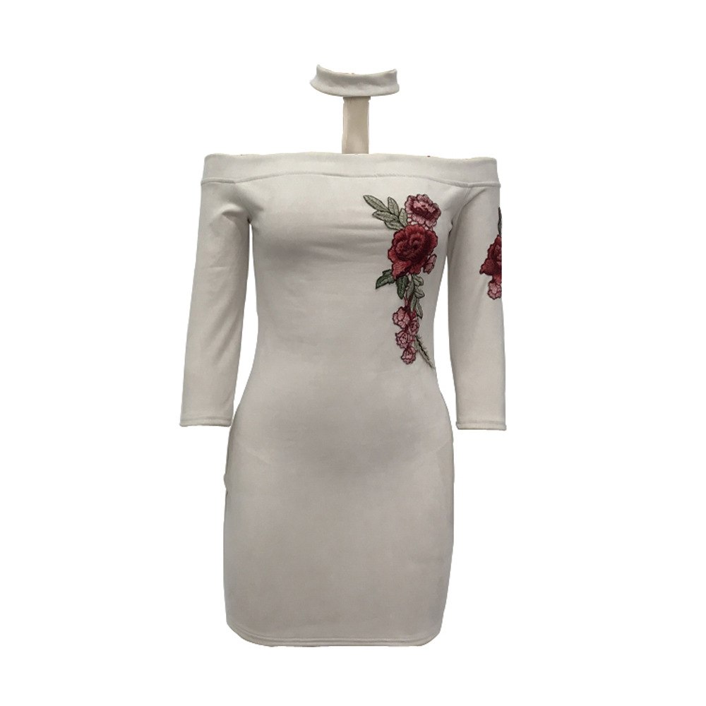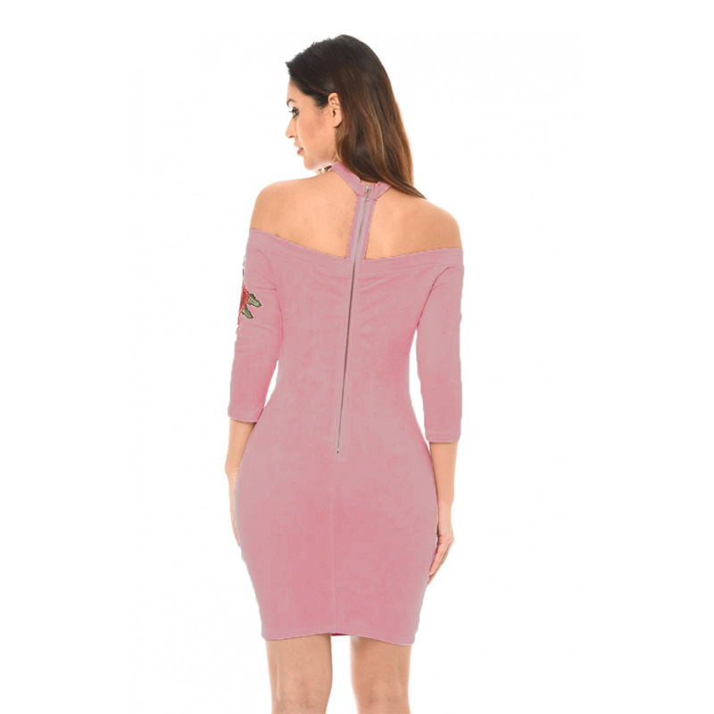 Shoulderless Choker Neck Suede Dress Women Rose Flower Embroided Bandage Mini Dress