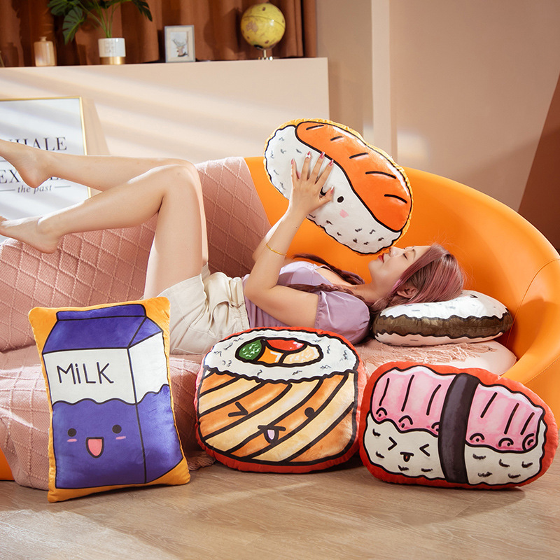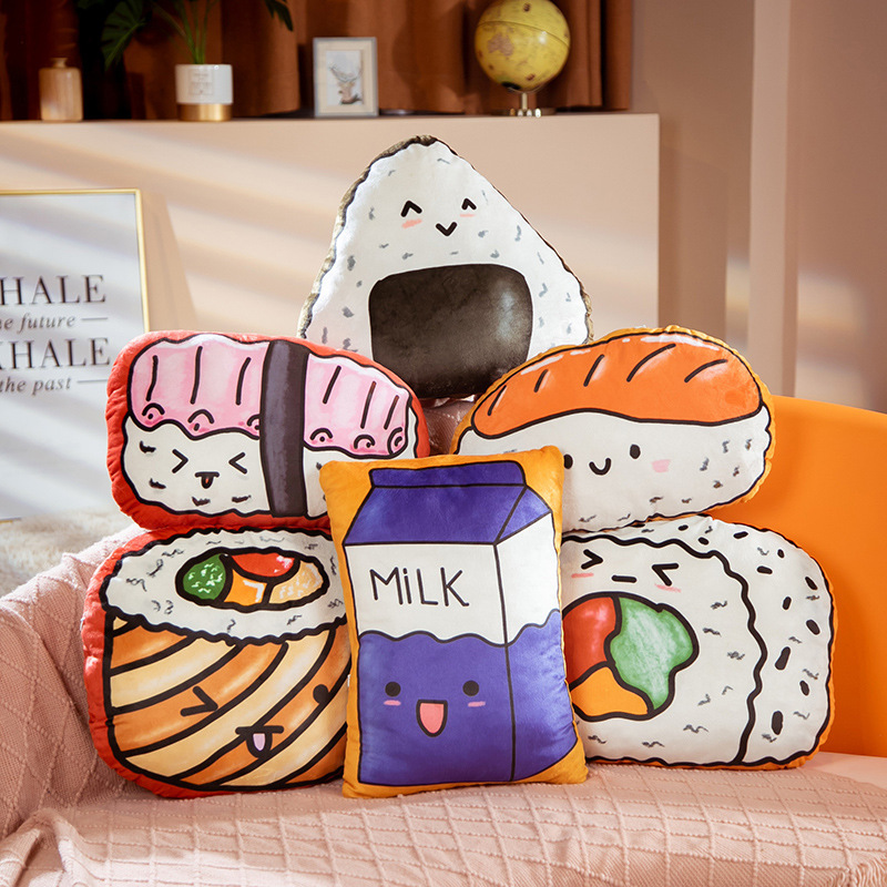 Material: PP cotton, plushStyle: fashion casualFeatures: Sushi shapeColour: Sushi, milk, rice balls, crab stick sushi, cod, salmon