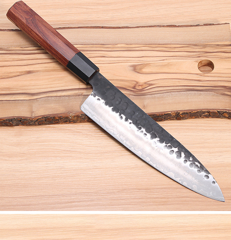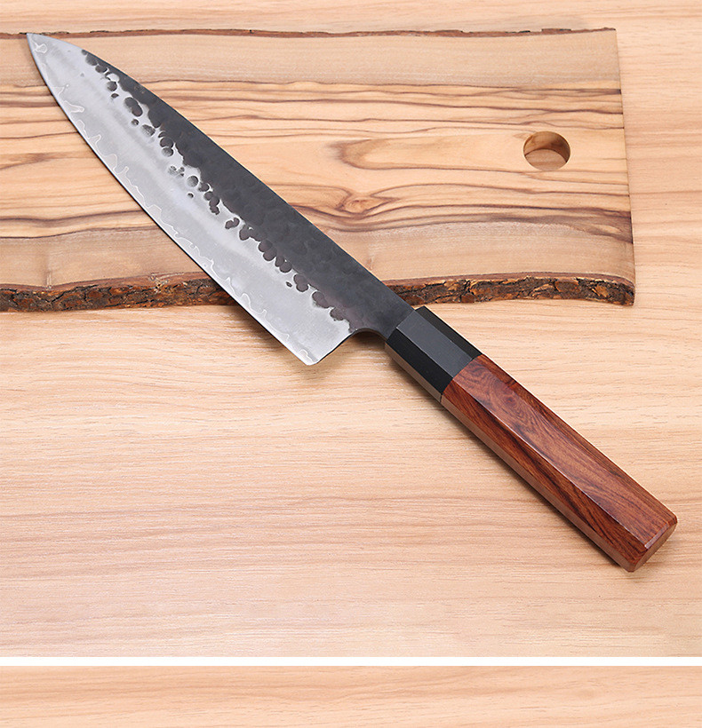 Product name: 8 inch chef knife (universal knife)Net weight: 218GBlade material: three-layer forged 9Cr 18Mov steelBlade thickness: 3.0MMHandle material: ebony + 6063-T6 aluminum alloyBlade hardness: Rockwell 60 + 2