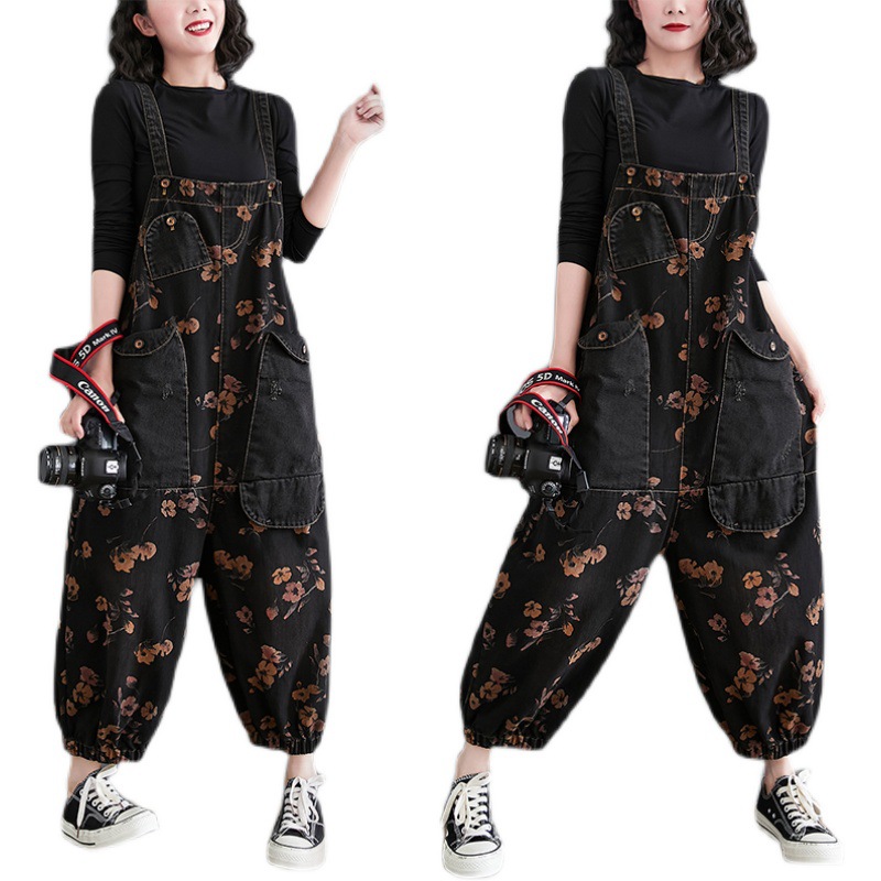 2021 new style literary fan denim print cropped overalls female plus size fat MM flower print bloomers were thin