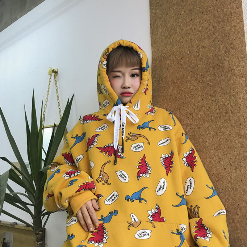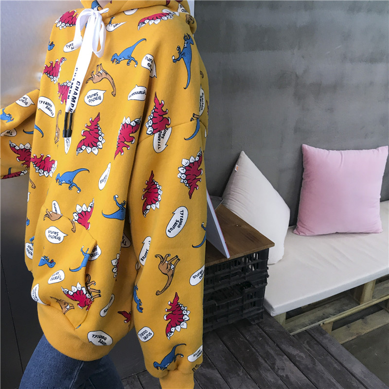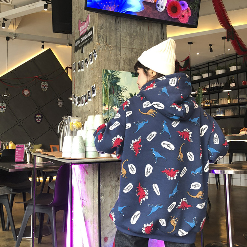 autumn new Japanese sweet student loose coat small dinosaur print hooded sweater casual blouse