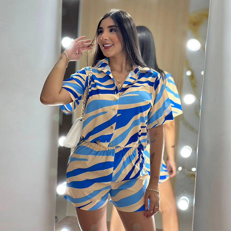 Women's Fashion Temperament Printed Short Sleeve Lapel Shirt Shorts Suit