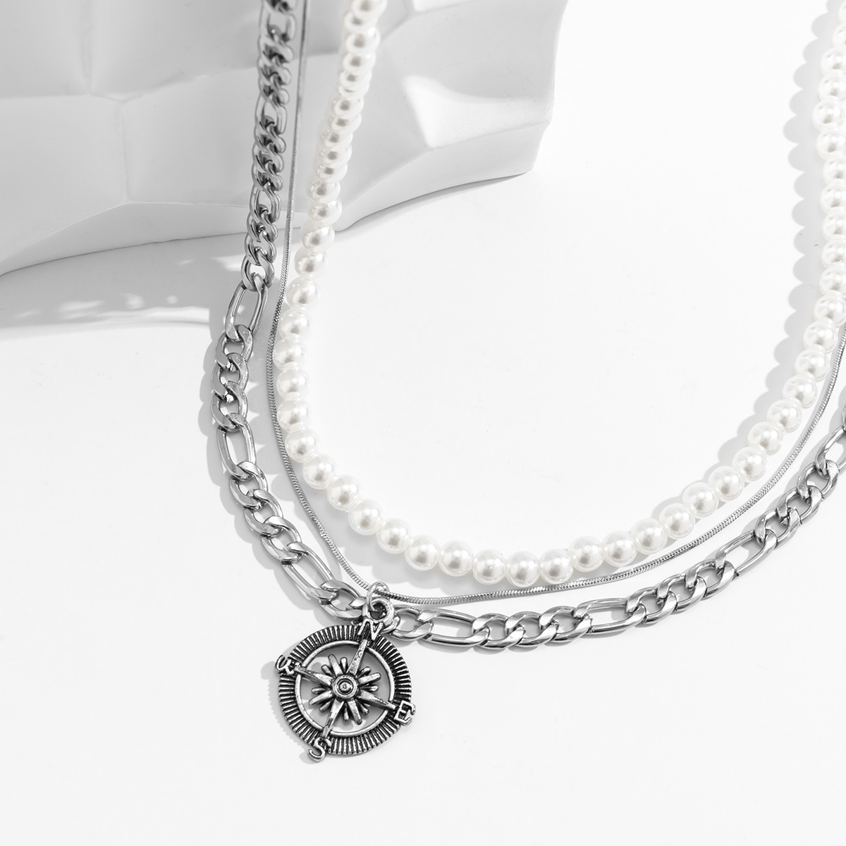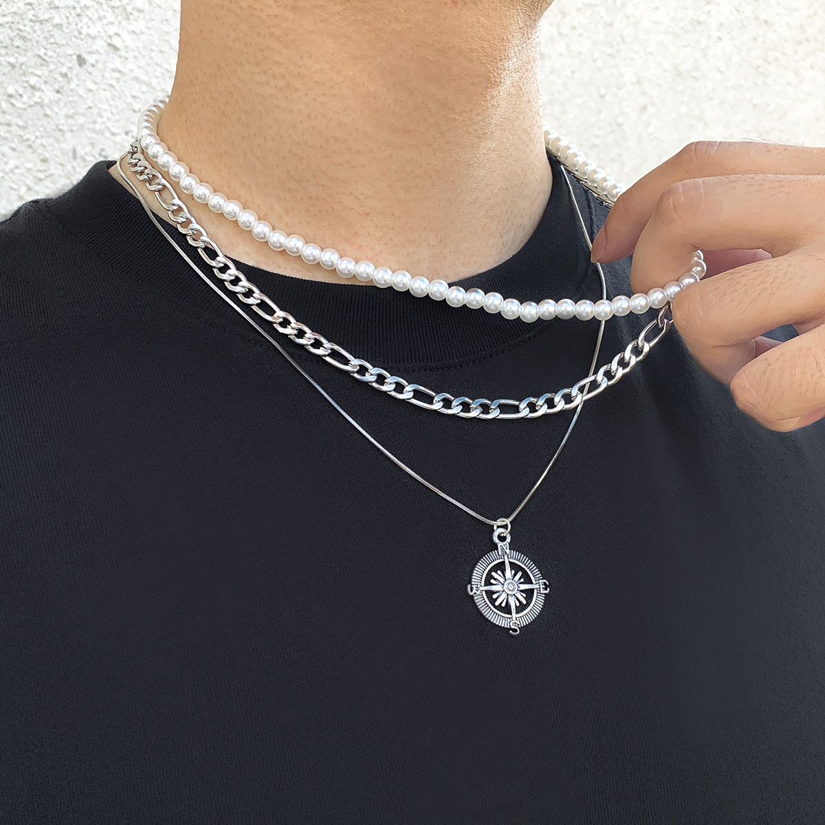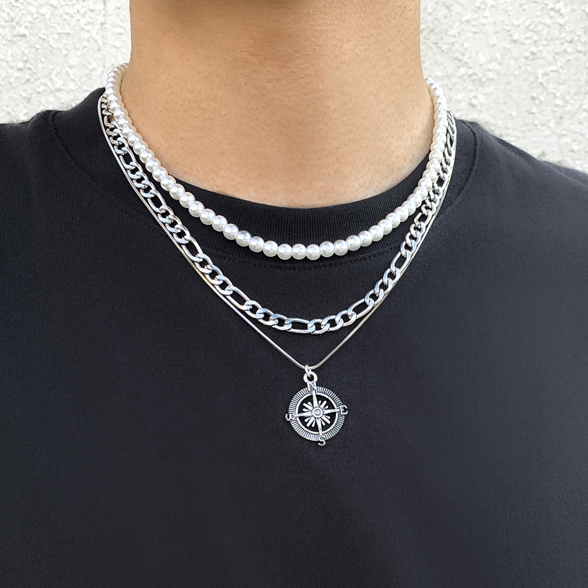 Mens Fashionable And Versatile Multi-layered Stacked Vintage Compass Pendant Necklace