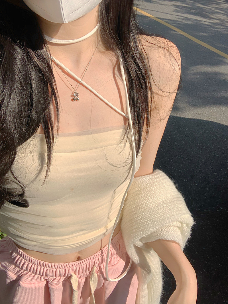 Color classification: White knitted blouse, pink mesh hanging neck tube top, sea blue mesh hanging neck tube top, apricot mesh hanging neck tube top