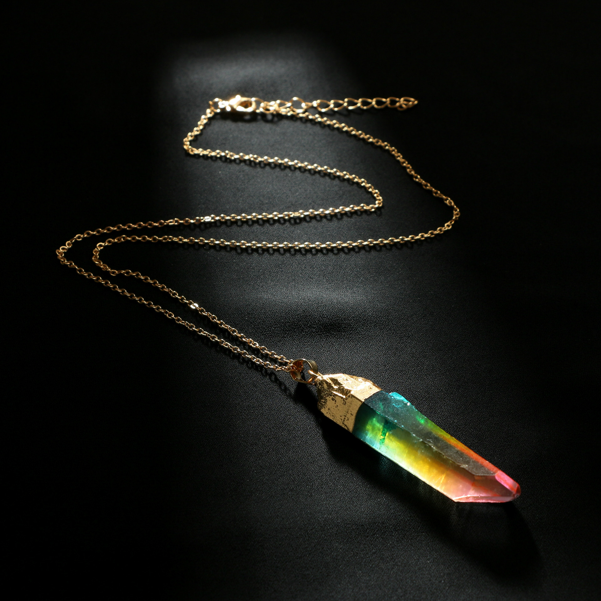 Original stone cylindrical mixed color crystal gold rim single ring pendant necklace