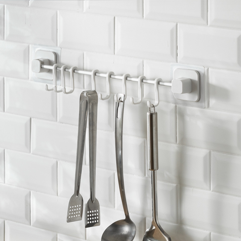 Commodity name: Kitchen hookProduct size: 43X8X5.2cmProduct weight: 62gProduct weight: 2kgProduct color: Elegant whiteSpecifications: 8 hooksMain material: PS, aluminum.Product packaging: Kraft paper box