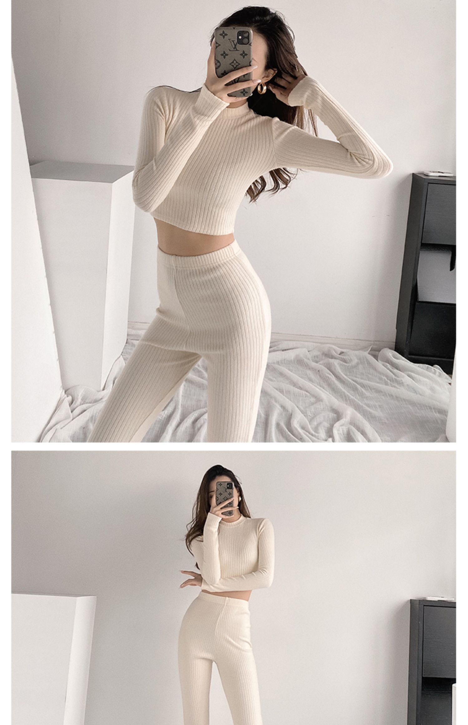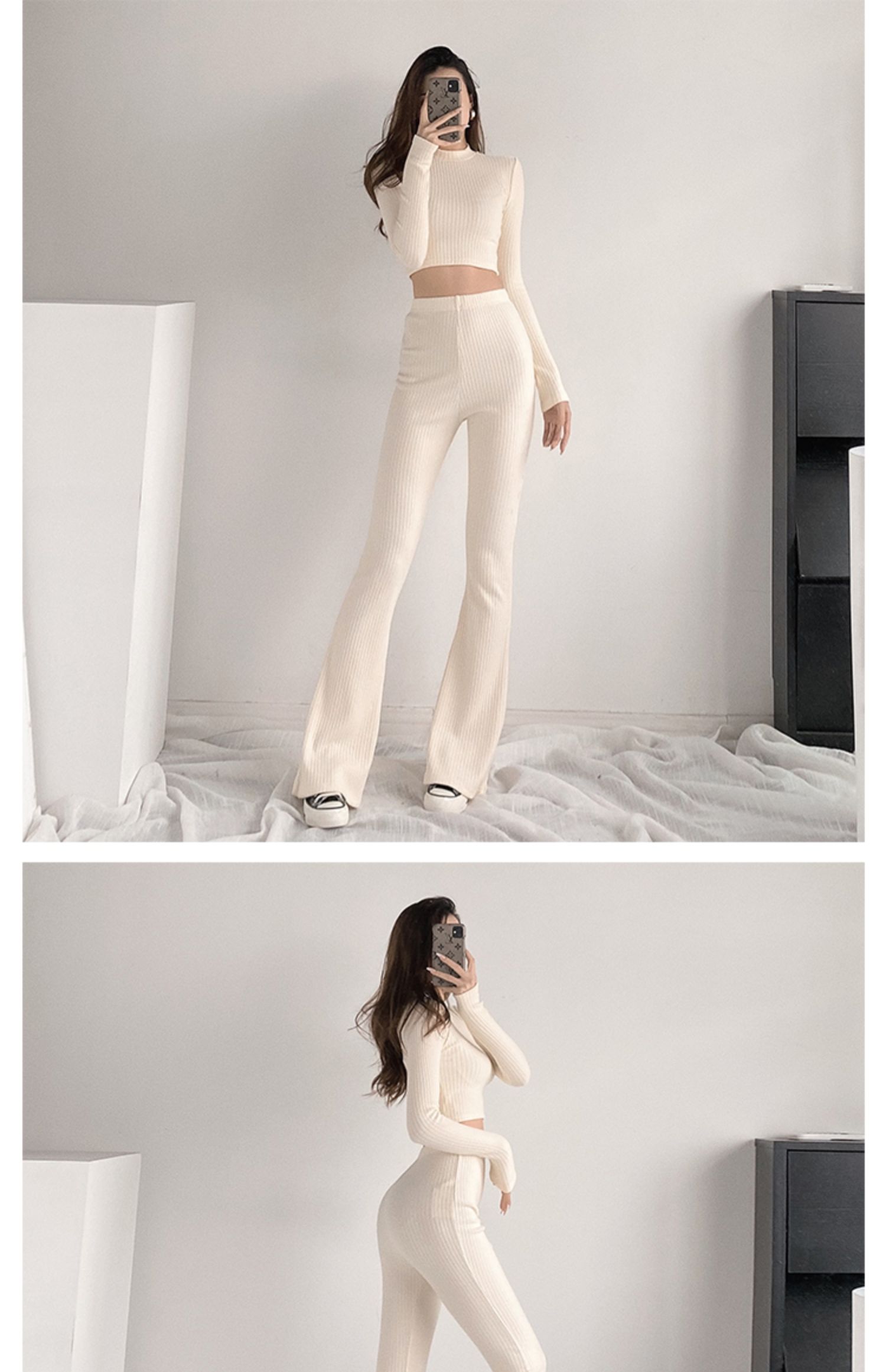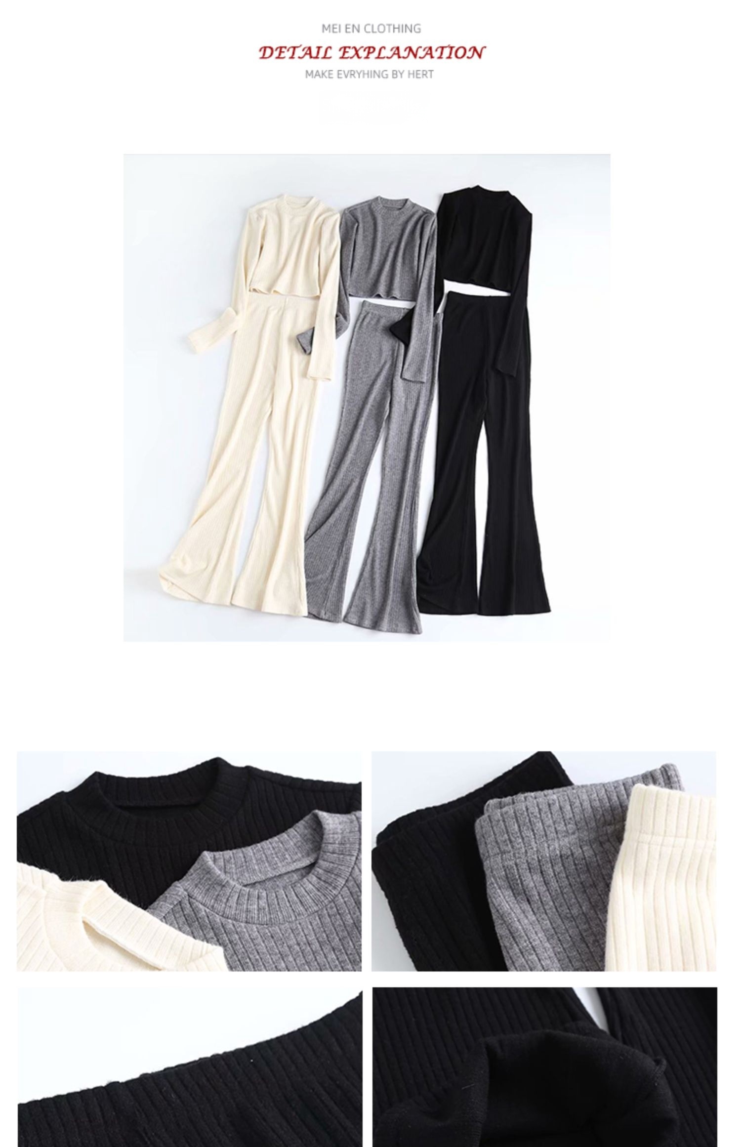 Color classification: (suit) melange gray, (suit) Black, (suit) creamy-white, (top) melange gray, (top) Black, (top) creamy-white, (pants) melange gray, (pants) black, (pants) creamy-white