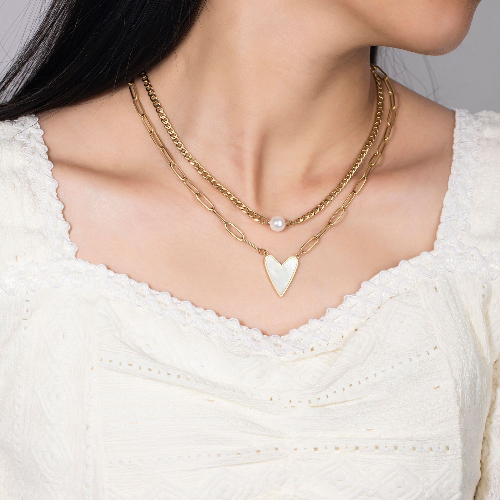 Color: N1508-pearl necklace, N1509-peach heart necklace, E530-stud earrings