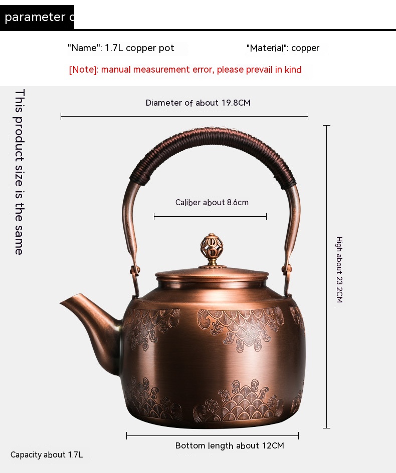 Product information:Color: 1.7L red copper pot-HAILANG, 1.7L red copper pot-front Swallow, 1.7L red copper pot-wood grain Surface Technology: high temperature resistance Material: Copper Style: light luxury With or without tea tray: no
