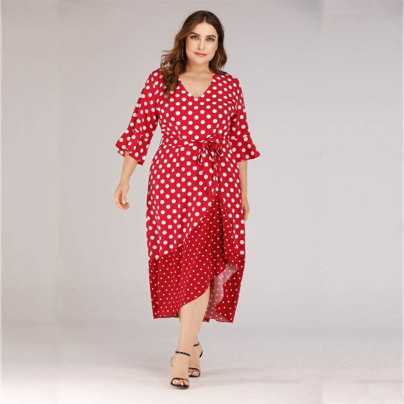 Plus size V-neck lace ruffled polka dot dress