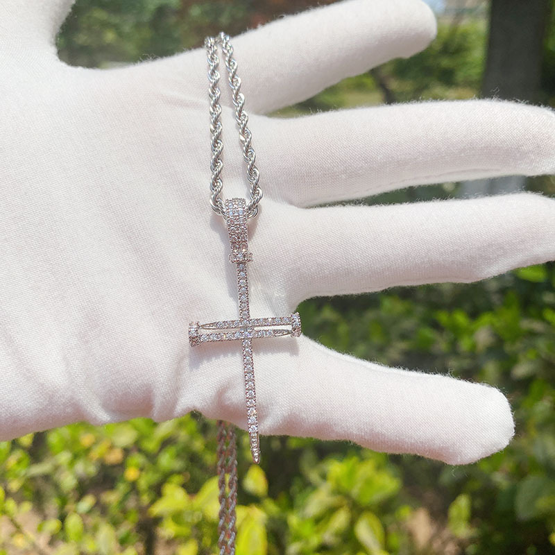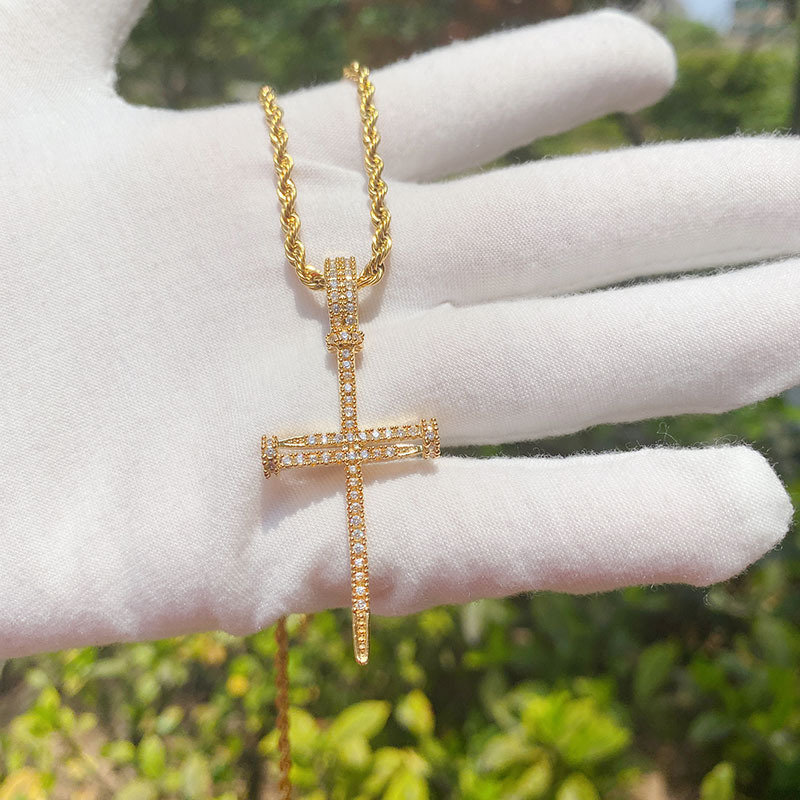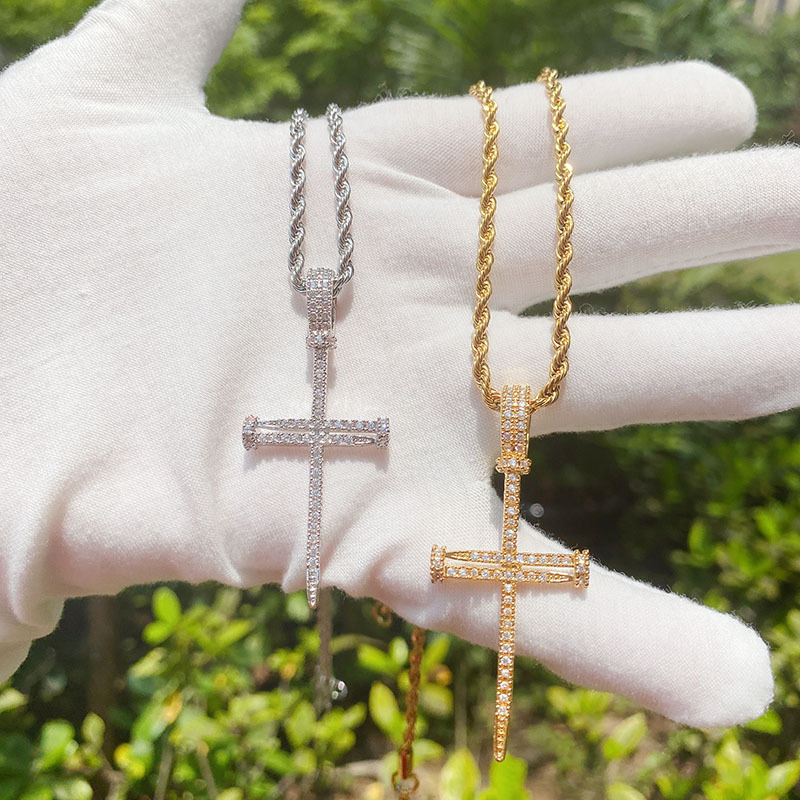Copper Inlaid Zircon Nail Cross Pendant Hip Hop Necklace