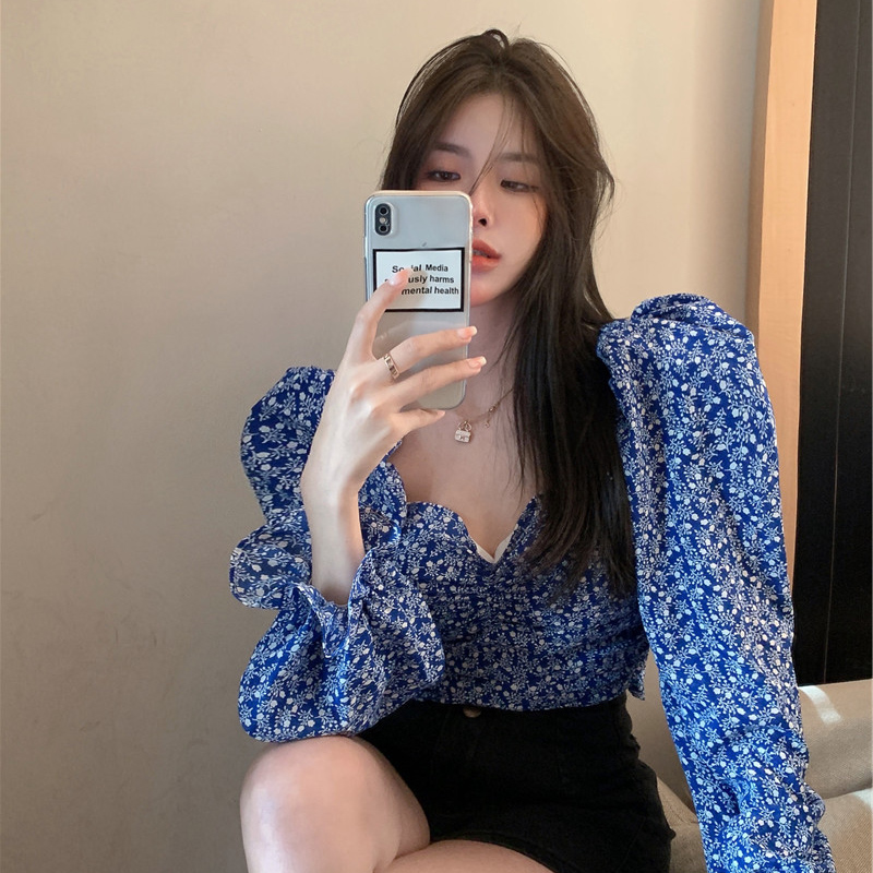 Product information :Color classification: bluePattern: floralSleeve type: bubble sleeveClothing version: loose typeSize Information:Size: s code m code l code XL code 2XL code 3XL code 4XL codePacking list:Coat *1