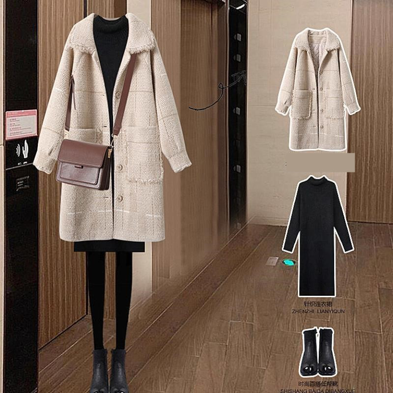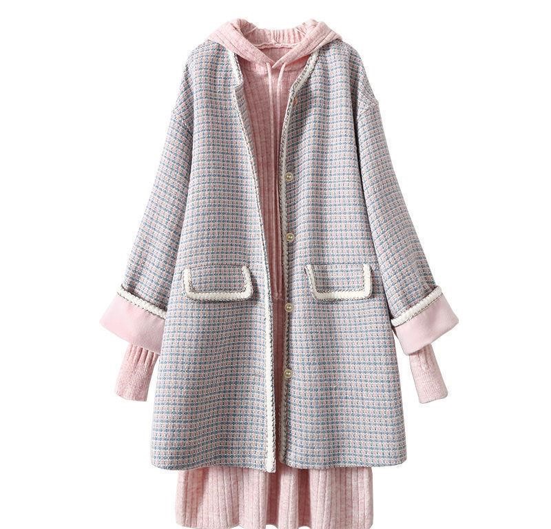 Color classification: 1 style 6581 knitted skirt + 6582 woolen jacket, 2 style 6614 sweater dress +6611 blue jacket 3 style 6614 sweater dress +6611 pink jacket 4 style 6614 sweater dress +6611 apricot jacket, 6582 woolen jacket, 6611 Blue jacket, 6611 pink jacket, 6611 apricot jacket, 6614 sweater dress, 6581 knitted skirt