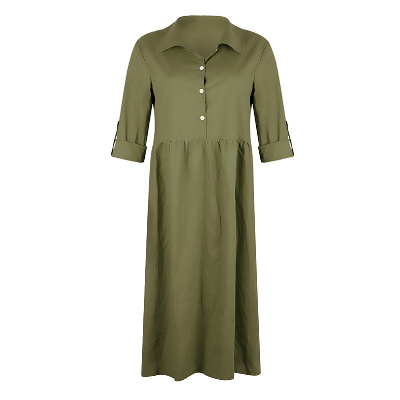 Style: Europe and Americapattern: plain Skirt length: mid-length skirtCollar type: Lapel collar / POLO collarSleeve length: long sleeveWaist type: loose waistFabric: cotton and linenColor: Khaki, Purple, Blue, Army Green, Brick Red