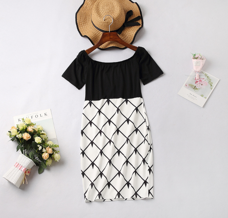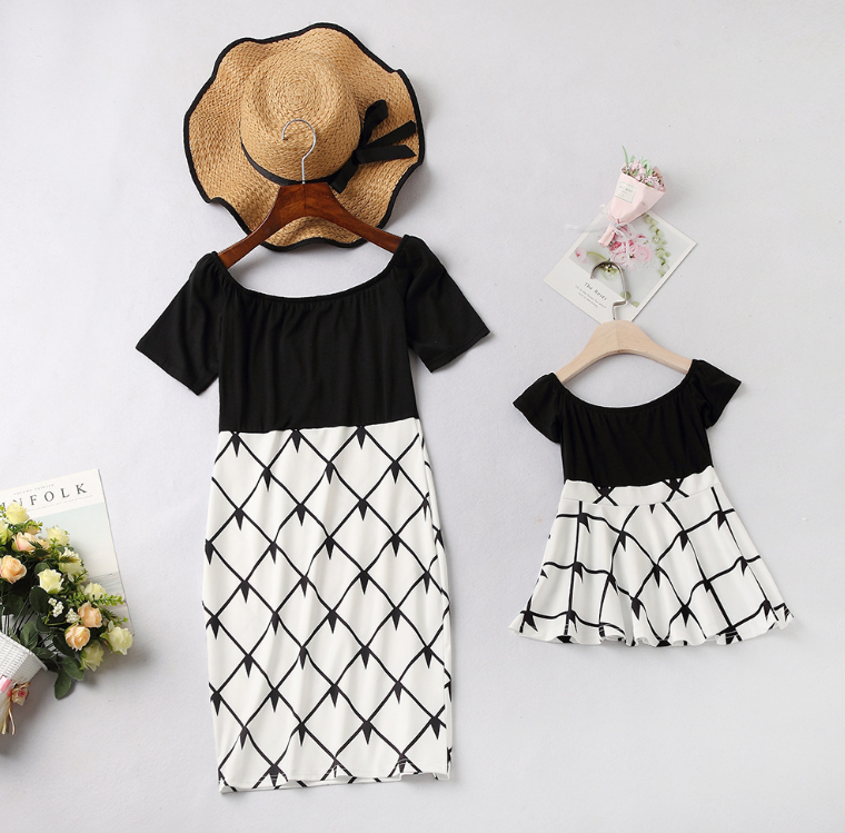 Europe and the United States parent-child mother and girl off-the-shoulder print skirt one-shoulder women's clothing