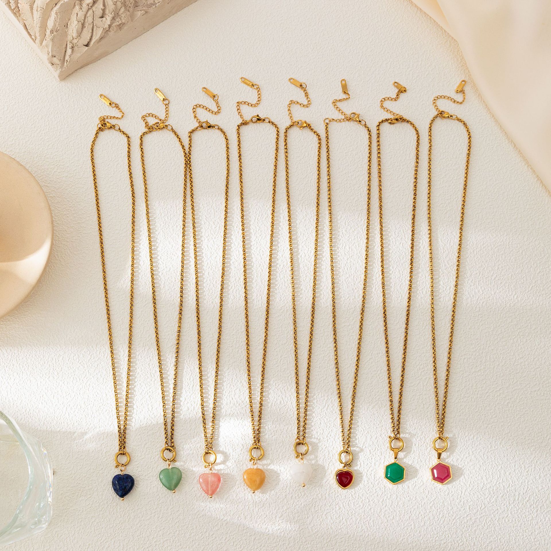 Color: green hexagon (pendant), pink hexagon (pendant), Blue loving heart (pendant), pink love heart (pendant), white love heart (pendant), yellow heart shaped (individual pendant), dark red love heart (separate pendant), Green Heart (separate pendant), separate chain
