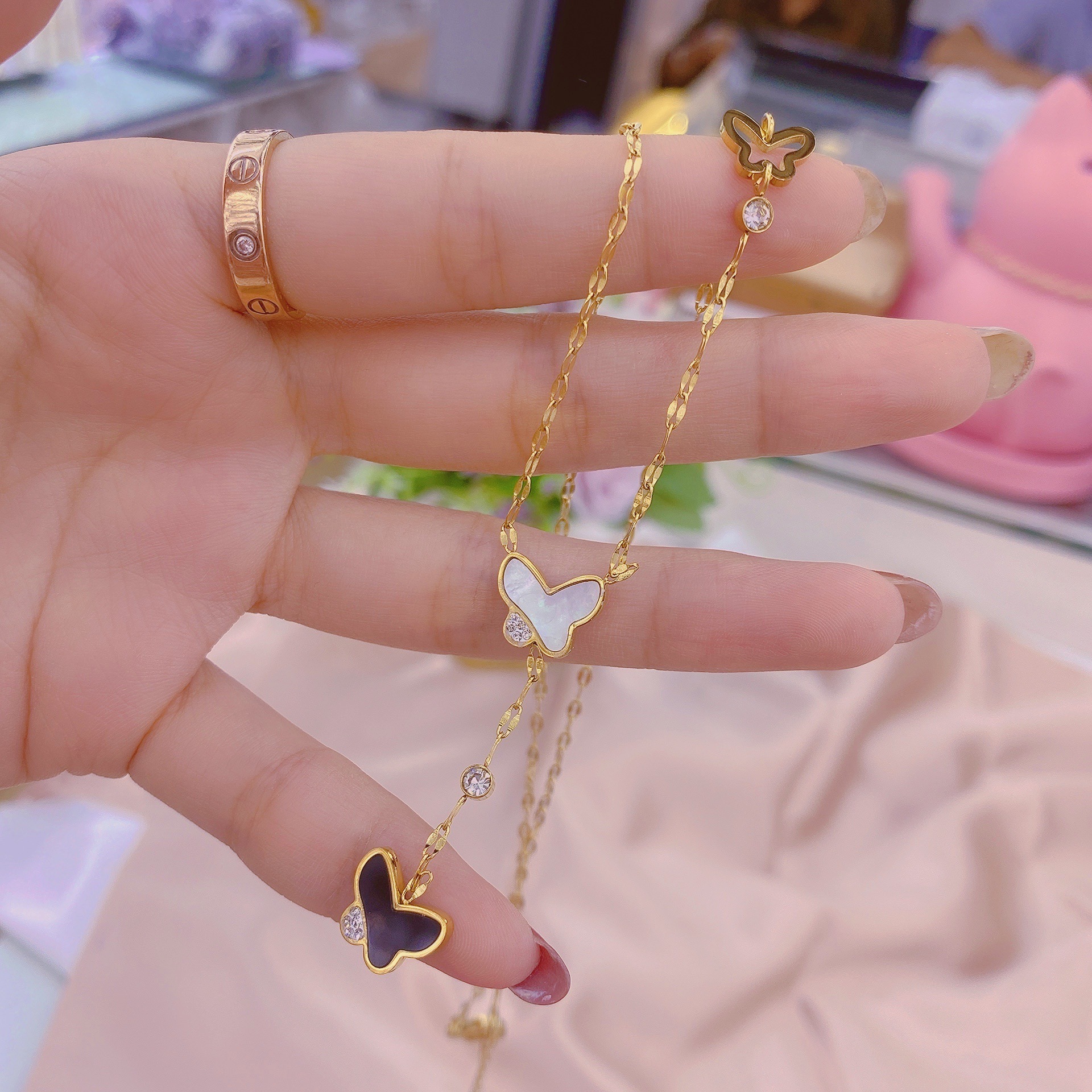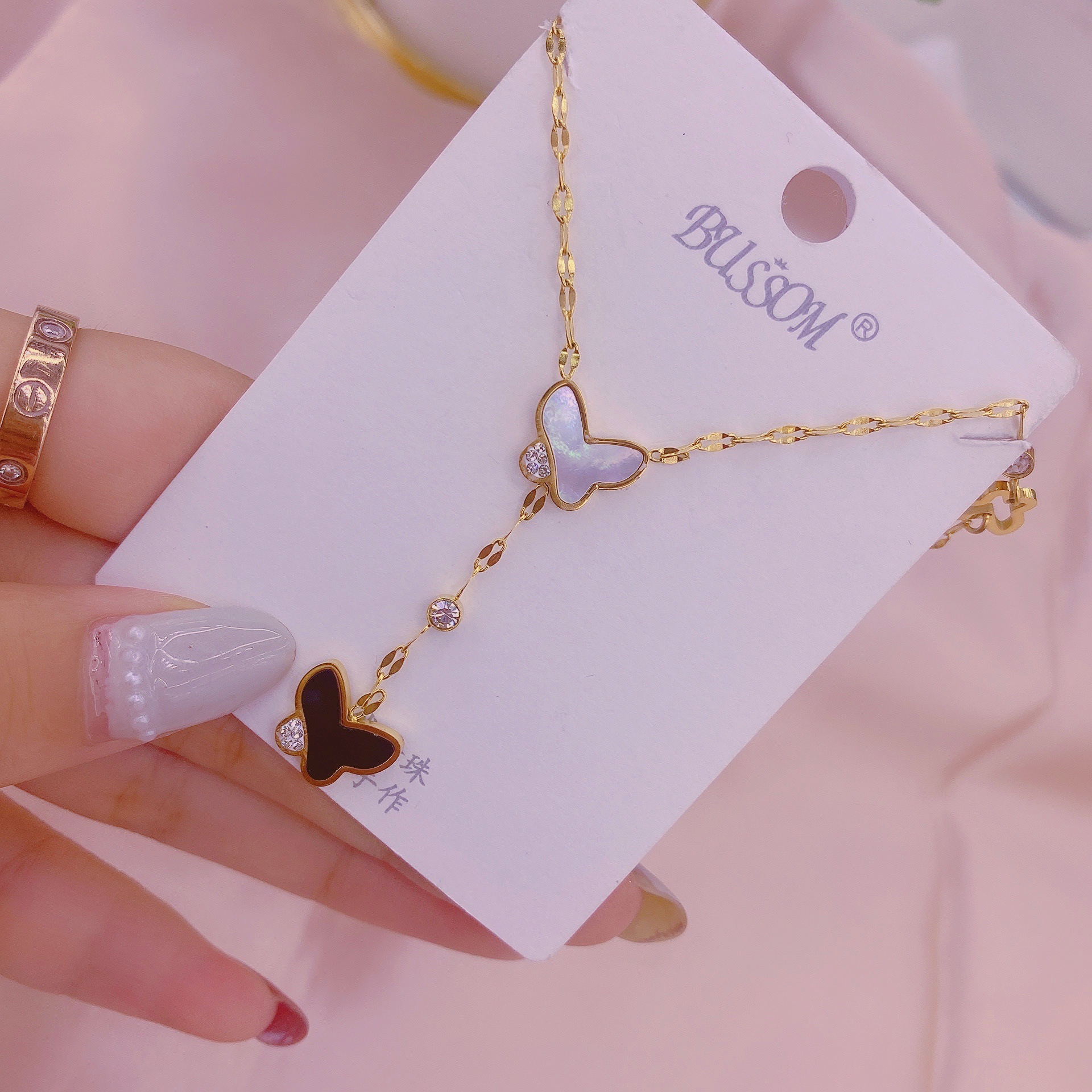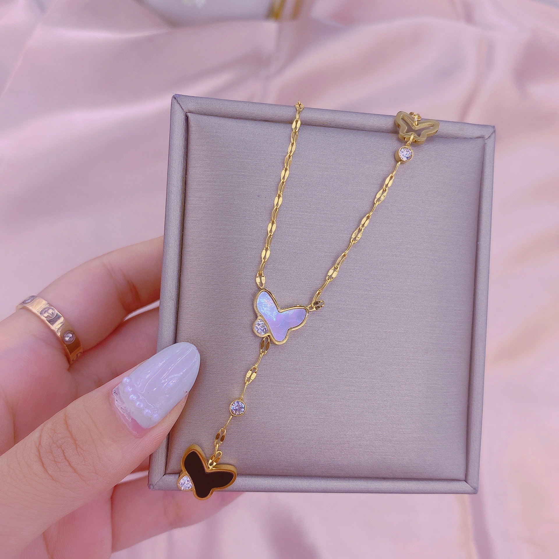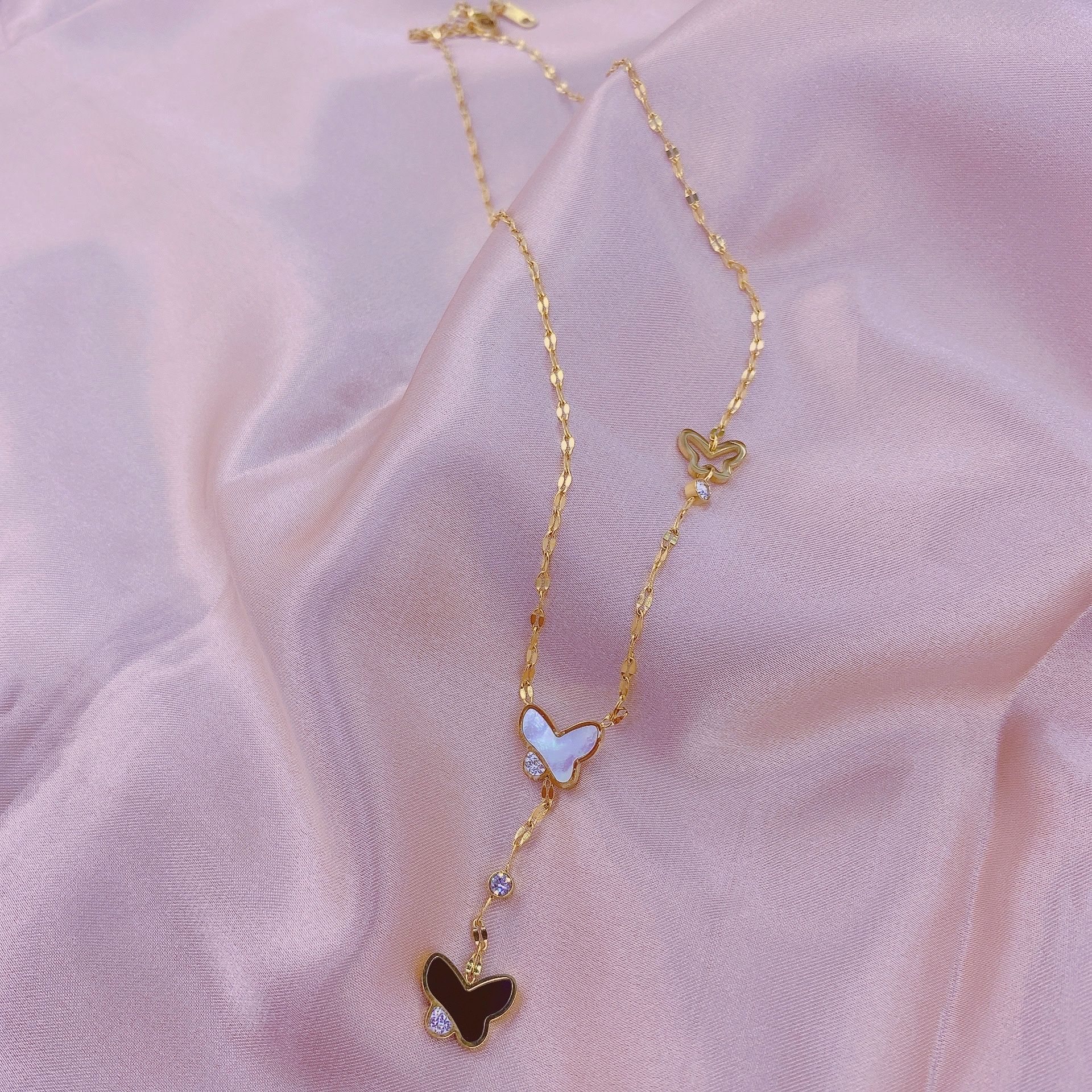 Material: titanium steelStyle: Women'sModeling: ButterflyChain style: water wave chainWhether to wear a pendant: YesColor as shown