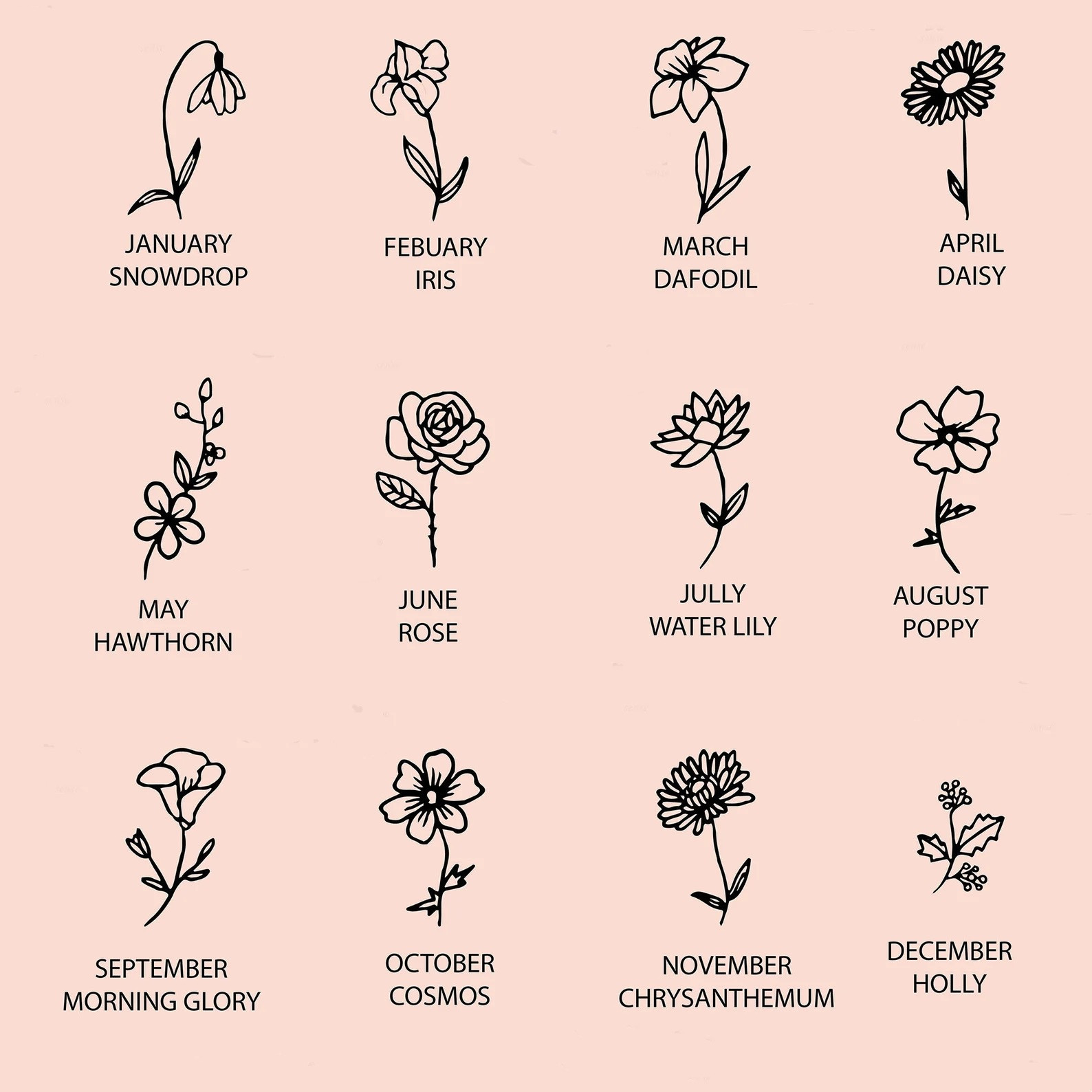 Colour:December-Holly,January-Snowdrop,February-Iris,March-Daffodil,April-Daisy,May-Hawthorn,June-Rose,July-WaterLily,August-Poppy,September-Mornng glory,October-Cosmos,November-Chrysanthemum