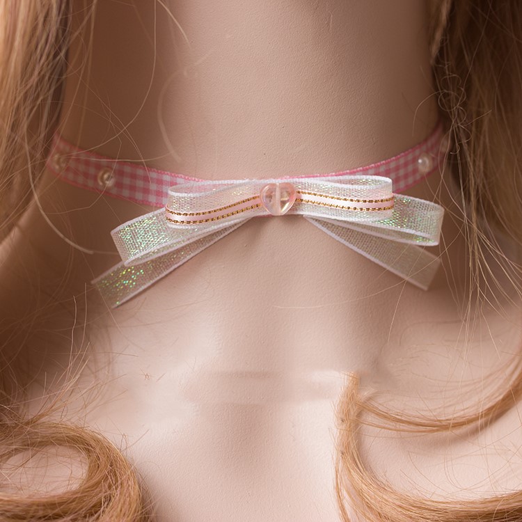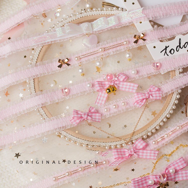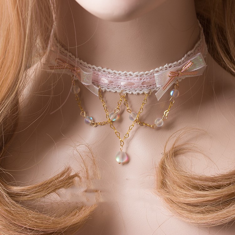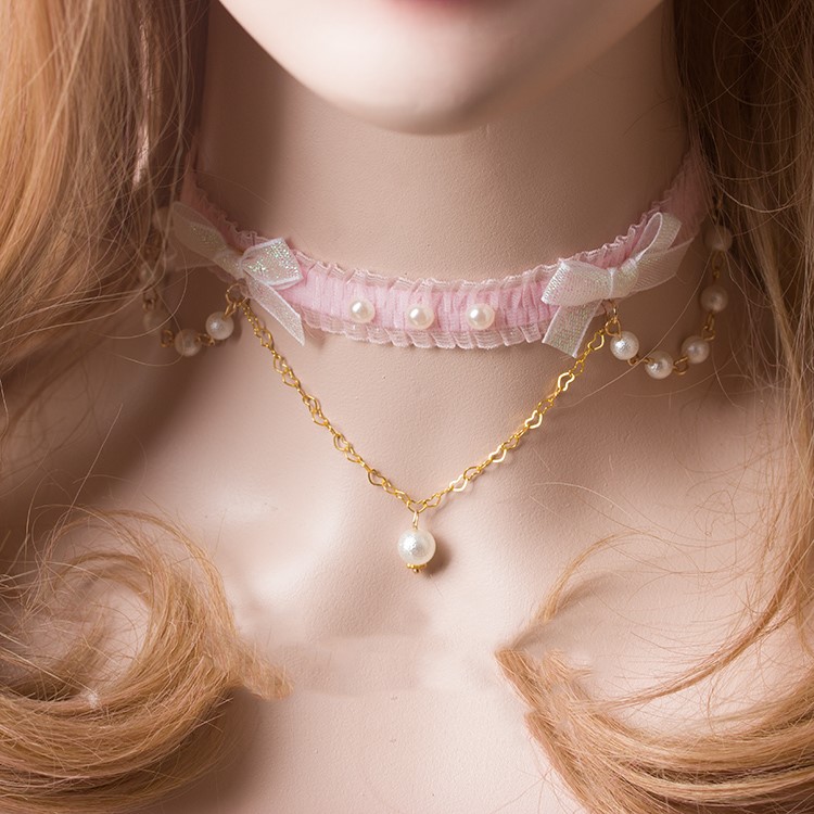 Pink set - see chain collar collar original hand made pearl bow soft girls heart choker